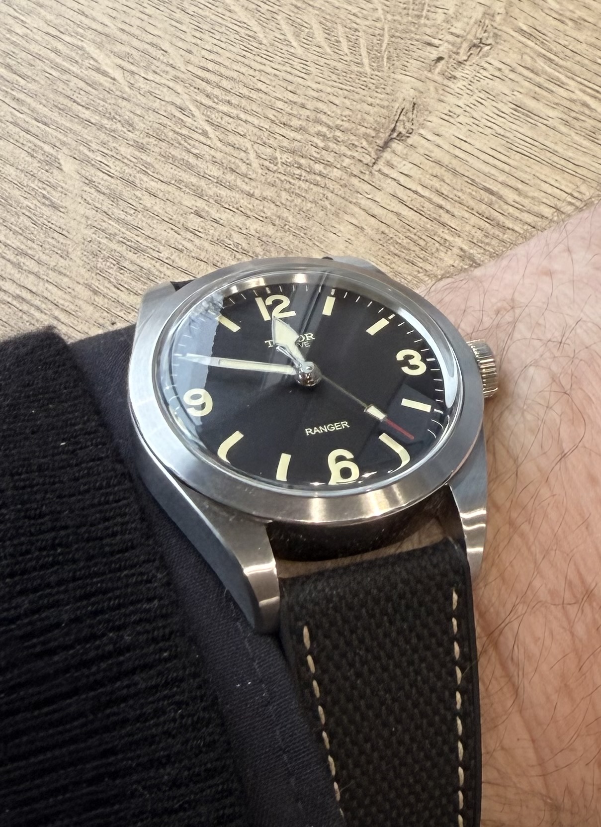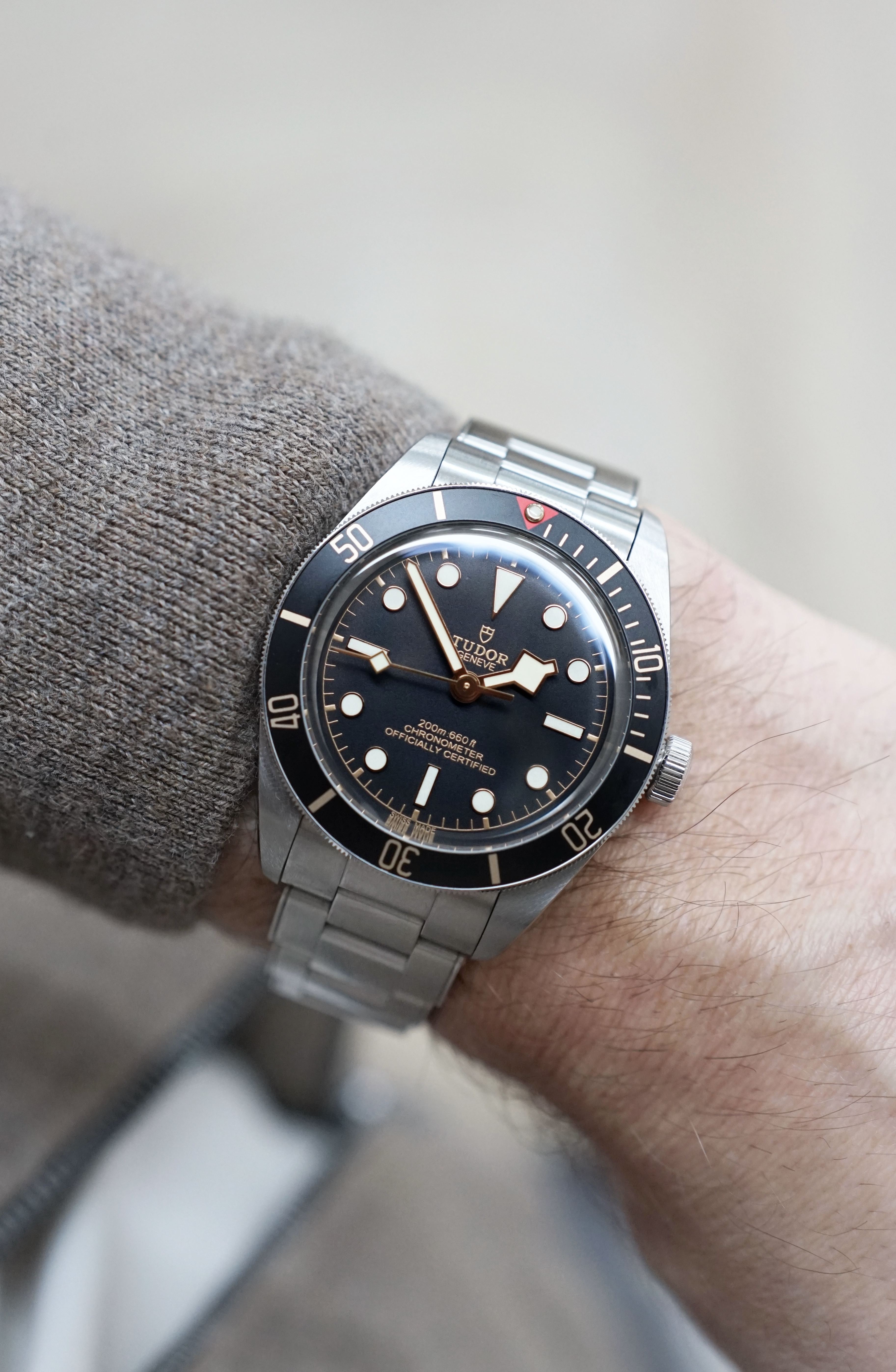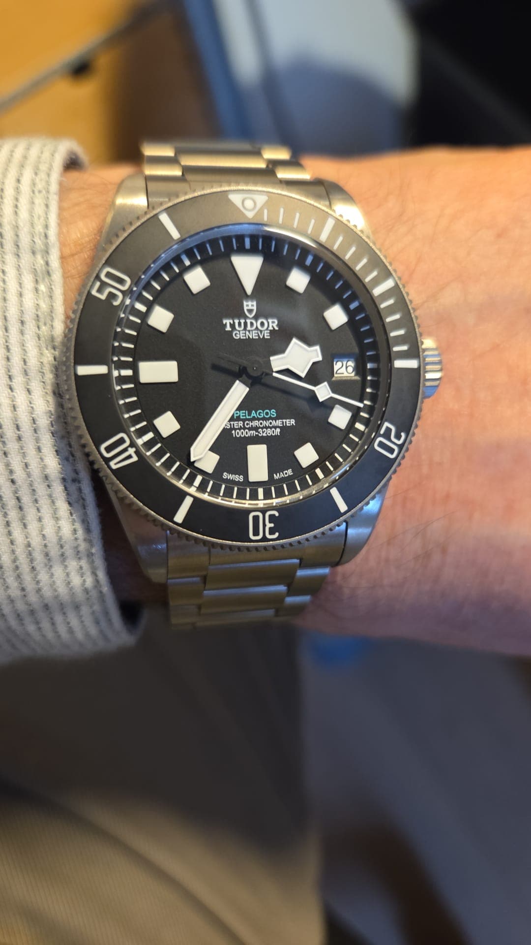 Groot met 43 mm, maar valt in de praktijk echt mee. Ik voel niet zo veel verschil met de vroegere 42 mm Pelagos, en draagt naar mijn gevoel zelfs kleiner dan de FXD. En natuurlijk licht om dragen, ondanks het formaat, door het titanium.