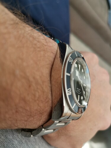 Huidige Tudor Black Bay 58 Blue (in house, 39mm) vind ik beter passen, iets kleiner en ook slanker om de pols