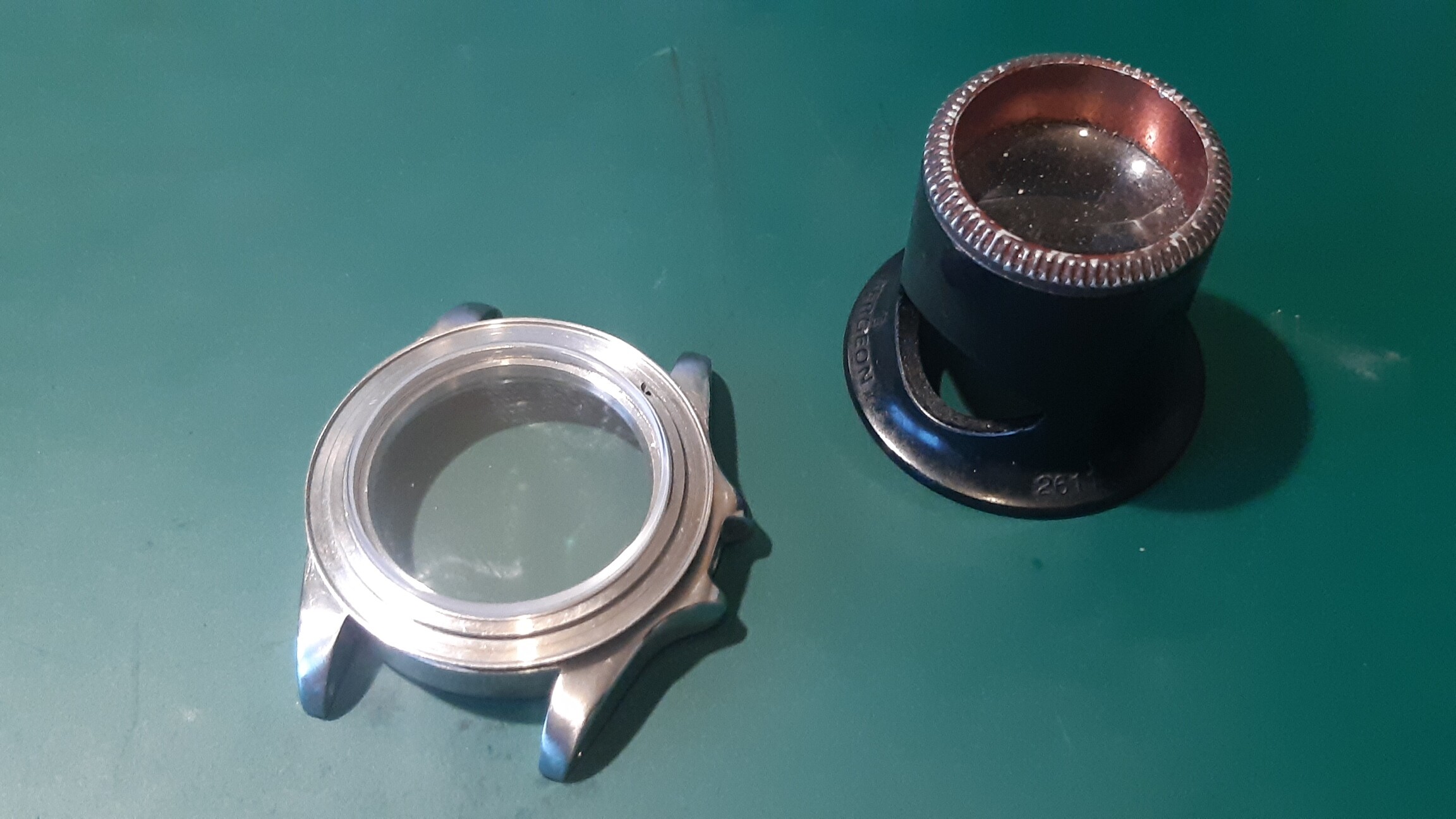 de bezel ligt er hier nog los op, er moet ook nog een pakkingring in de kast, maar zo klein heb ik ze niet in huis (ø29.0 mm binnendiameter)