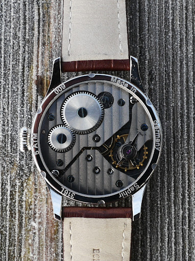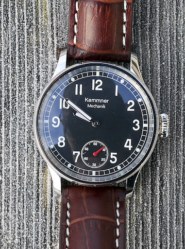 De Kemmner Marine is me zo goed bevallen dat ik bij Roland Kemmner nog een horloge heb besteld. Wederom zijn mijn ervaringen met communicatie, snelheid en kwaliteit bijzonder positief. Het betreft hier een zogenaamd Heeresdienstuhr (legerhorloge; de derde militaire horlogetak naast piloten- en marinehorloges. De versie die Kemmner standaard levert heeft een matte kast en een vlak glas. Ik heb gekozen voor een normale RVS kast en een licht gebold saffierglas. Het voordeel bij Kemmner is dat je diverse onderdelen naar eigen smaak kunt laten aanpassen, tm de kroon. Het Seagull 3620 uurwerk is uitgevoerd in PVD zwart (wordt door kemmner zelf gedaan).Uiteraard kun je ook een Unitas uurwerk, of een niet bewerkte Seaqull krijgen.