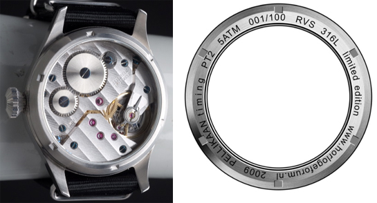 Verder: op de rand van de zichtbodem komt Horlogeforum.nl Limited Edition 2009 en de nummerring bv 01/25. Een kroko-lederen band tegen meerprijs (€ 120,-) bij te bestellen.