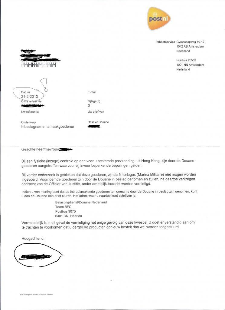 Ik scan hem morgen wel even in want dit begint echt een soap om van te smullen te worden. In het kort: PostNL meldt dat de horloges in beslag zijn genomen door de douane en dat ze worden vernietigd. En of ik nooit meer die dingen wil importeren anders loopt het slecht met me af.