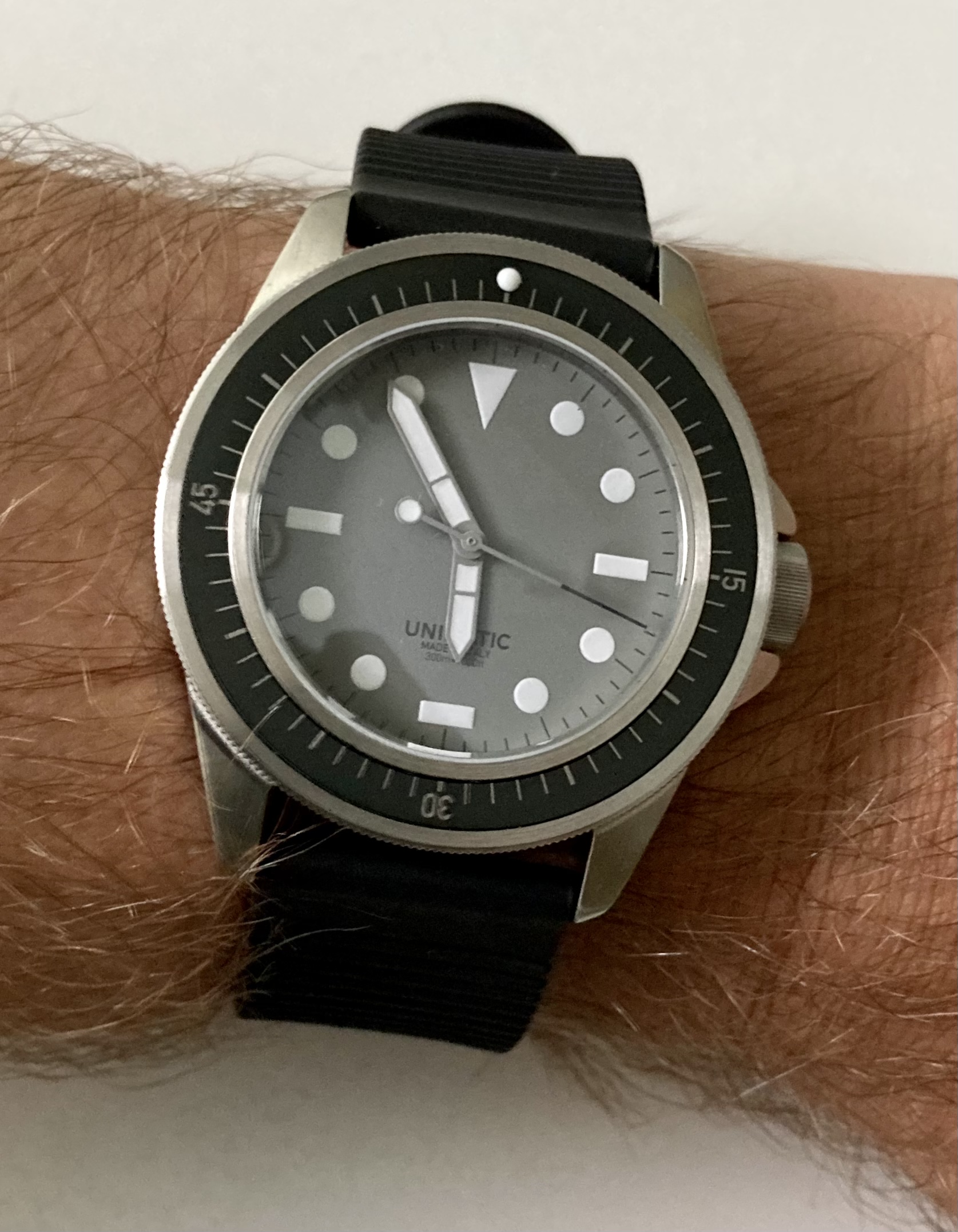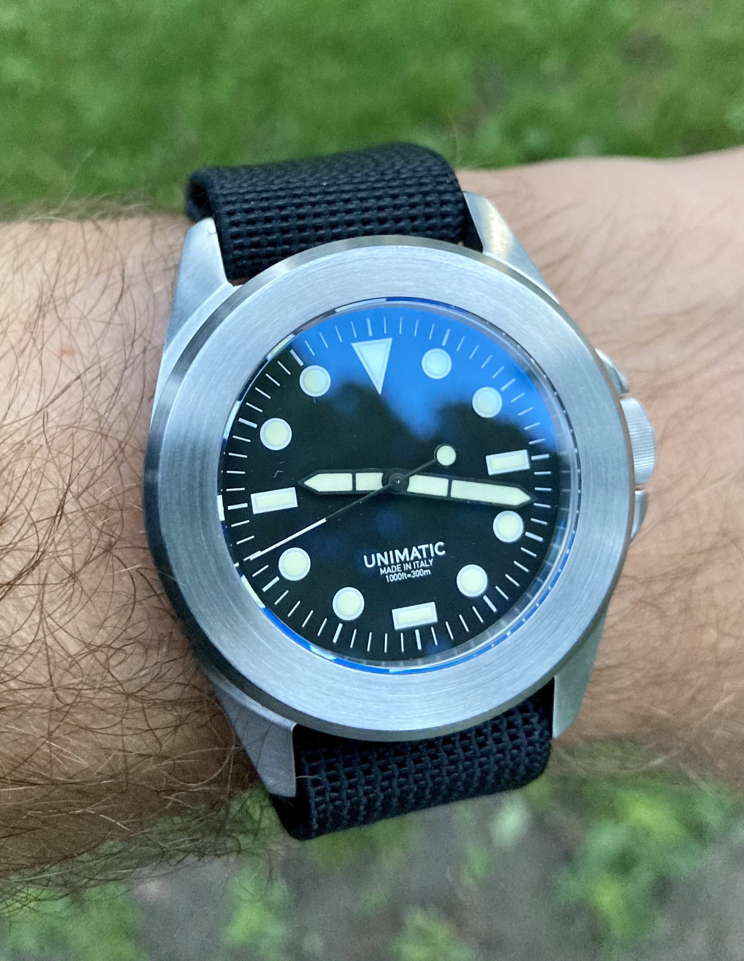 Ah, toevallig kom ik dit tegen (heb net de U1-EMN aangeschaft, en ben aan het bijlezen): ‘At 41.5mm across the bezel and 14mm thick at the top of the crystal, these Unimatic’s are nicely proportioned, and with 22mm lugs they wear not unlike a Black Bay or a Seiko SKX007.’