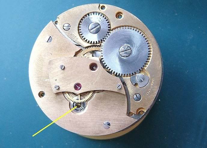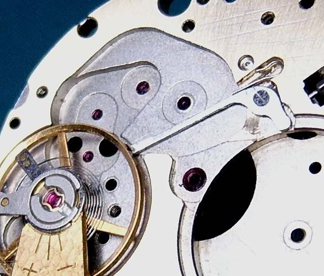 Wordt de kroon uitgetrokken naar de wijzerverzetstand, dan duwt het veertje de hevel opzij, totdat het kleine messing pennetje aan het uiteinde van deze hevel tegen het balanswiel komt, deze stopt dan direkt: