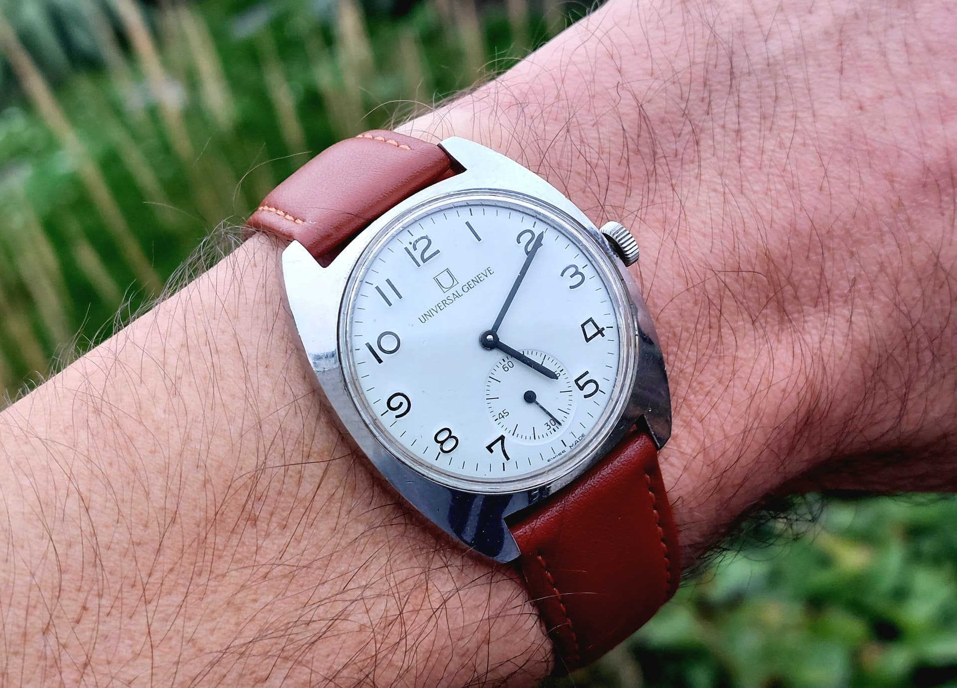Hier is mijn bijdrage: een vintage Universal Genève uit de jaren 60 met het handopwindbare kaliber 1200. Hij liep niet, maar met onderdelen van een donoruurwerk en een nieuwe veer tikt hij weer. Ik heb ook de wijzers en markeringen opgefrist – de plaat en de kast vertonen ouderdomssporen, maar dat is juist de charme.