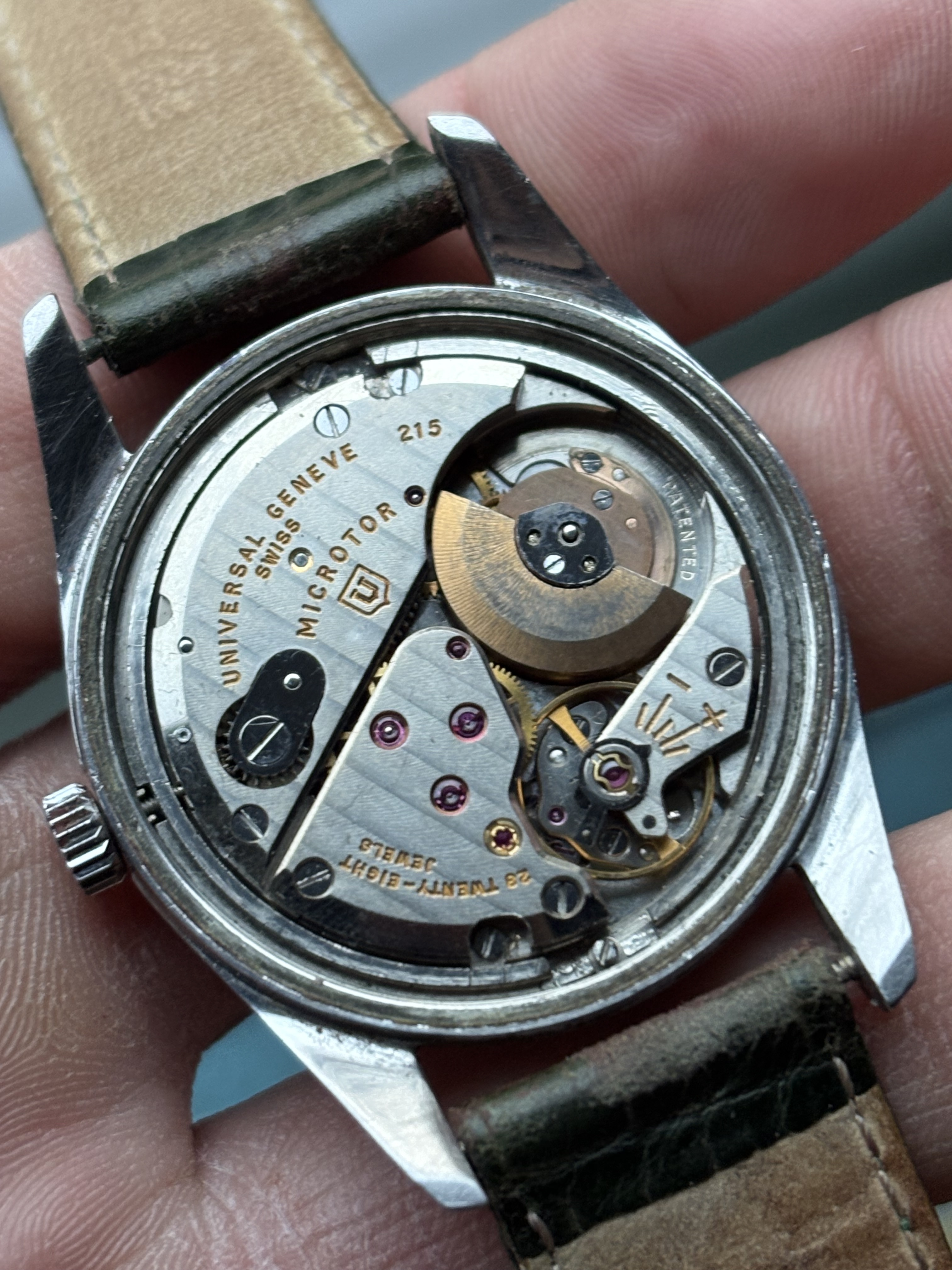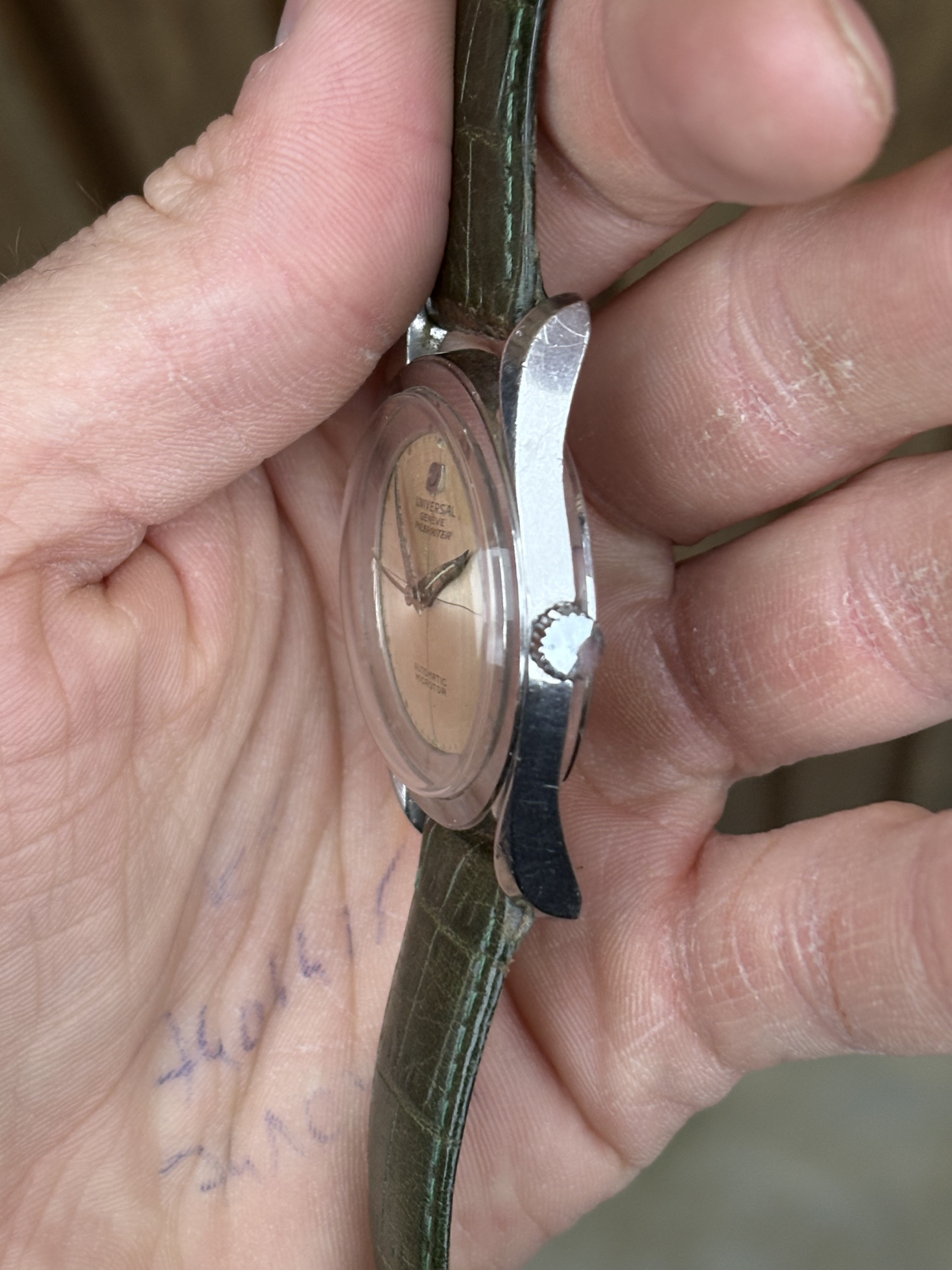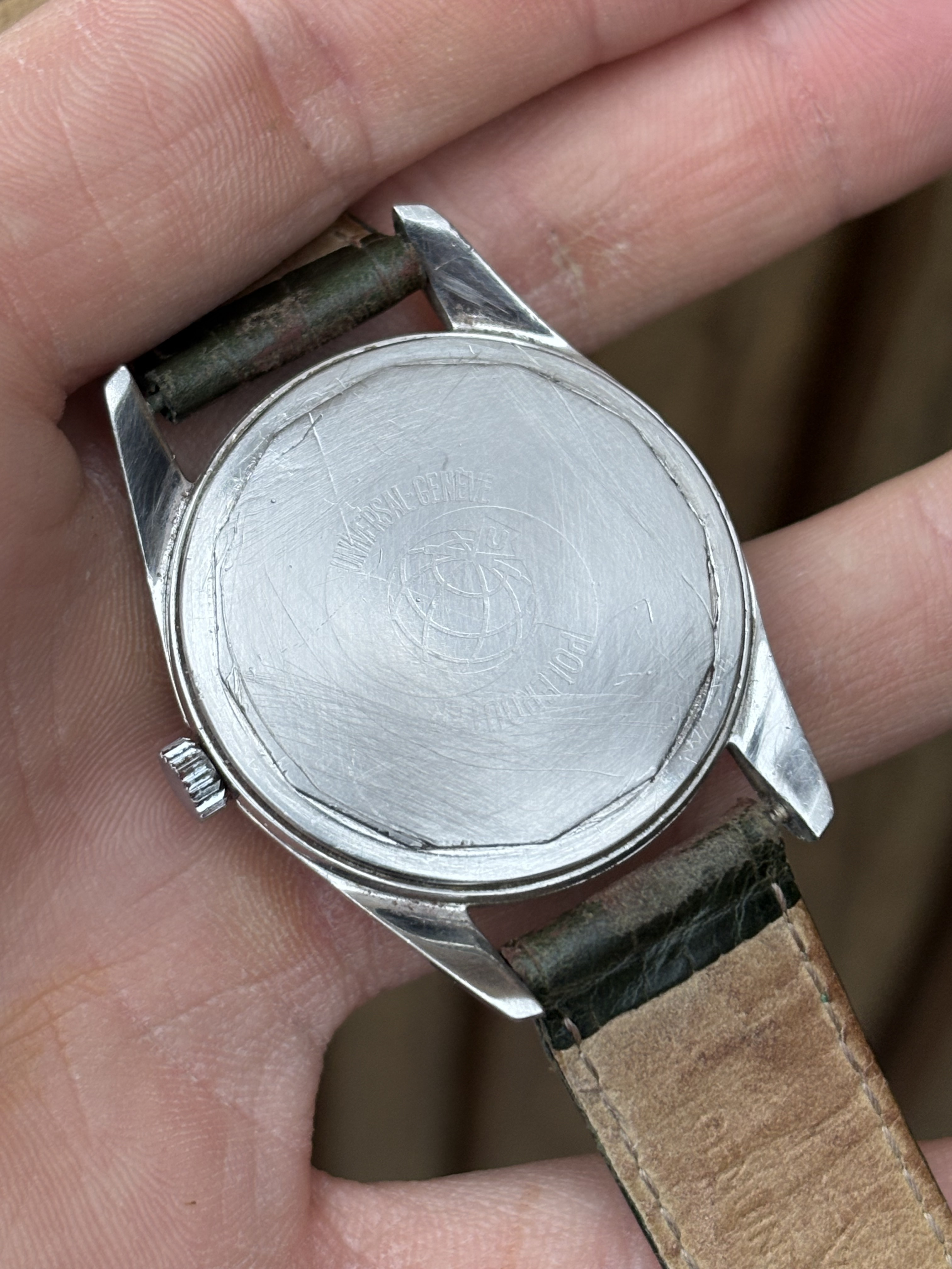 UNIVERSAL GENEVE “Polerouter” met automatische microrotor, zeldzaam exemplaar uit de jaren 50. Geschroefde caseback met afbeelding van de wereldbol en Universal Geneve Polerouter-opschriften die nog leesbaar zijn. Dit exemplaar heeft een neutrale kroon. Originele zilveren wijzerplaat in prima staat met patina. Zelfopwindend mechanisch uurwerk met microrotor, Universal Geneve kaliber 215, onderhoudsgeschiedenis hiervan is onbekend. Het horloge is 75 jaar oud en heeft zijn patina, niet in nieuwstaat, maar dat heeft zijn charme en is de prijs ook naar.