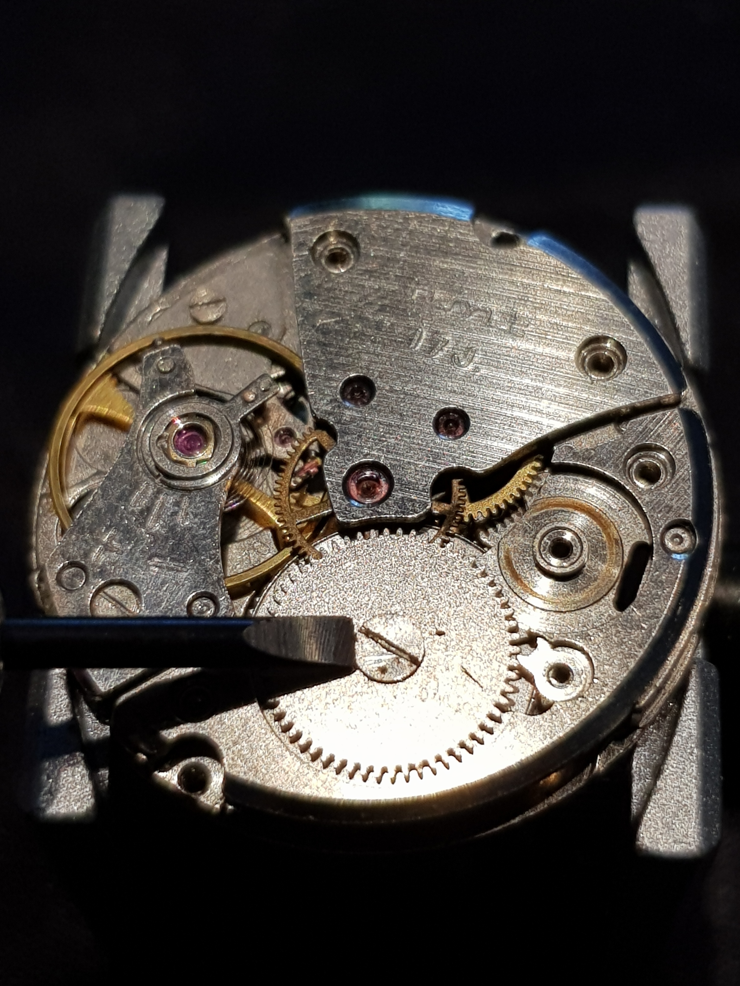 Op je eerste foto is de “click” nog zichtbaar (zonder schroejfe). Rechts onderin. Deze zorgt er voor dat als je het horloge opwindt, de veer gespannen blijft en niet kan ontwinden. De “click” wordt door een ragfijn veertje op z’n plek gehouden.