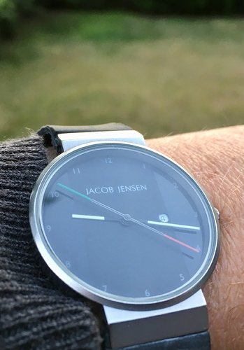 Vorig jaar kreeg ik een Sandoz handwinder goldcap cadeau bij een boek van €1,00. Vandaag schoot me te binnen dat ik een paar jaar geleden eens een B&O-achtig horloge zonder bandje kreeg van iemand die erbij zei “zie maar wat je er mee doet”. Vanmiddag er maar eens even mee bezig gegaan, Het deksel was er lastig af te krijgen, maar gelukkig trof ik geen oude batterij aan. Even e.e.a. uitgezocht en er een 377 ingestopt. Er zit een leuk Ronda uurwerkje in. Verder had ik nog een zwart rubber bandje liggen (ook gratis), maar voor het verkeerde horloge en veel te breed. Dit bandje aangepast aan Jensen en stevig kunnen monteren😀, aardig goed resultaat. Weer een mini projectje gelukt en alles gratis.