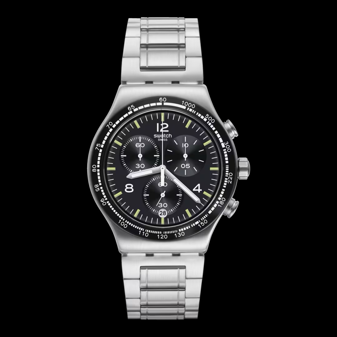 Swatch Night Flight, een Zwitserse chronograaf op staal voor €225. Leuk ding!