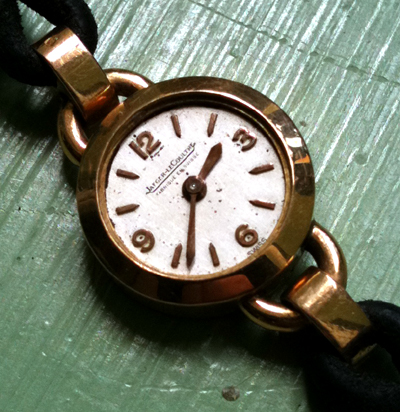 Gisteren waren we echter al aangekomen, na een overnachting ver over de helft, waren we er in de loop van de ochtend. Vlak voor het plaatsje waar we zitten zag ik de aankondiging van een vide-grenier die om 16 uur zou beginnen. Relaxed, hoef je ook niet vroeg op! Daar ben ik dus om 16 uur naartoe gegaan met het gezin. Het was 35 graden en ik ben nog niet helemaal gewend aan die knallende zon dus het zweet liep me in de ogen en toen ik een klein dameshorloge optilde dacht ik eerst dat dat het daardoor kwam. De dame die het verkocht riep meteen: C’est une LIP! Grappig (ik had geen LIP om), maar ik dacht toch echt dat er Jaeger-LeCoultre op de wijzerplaat stond. Combien madame? Cinq euro monsieur. Bon. Betalen en rennen!!!