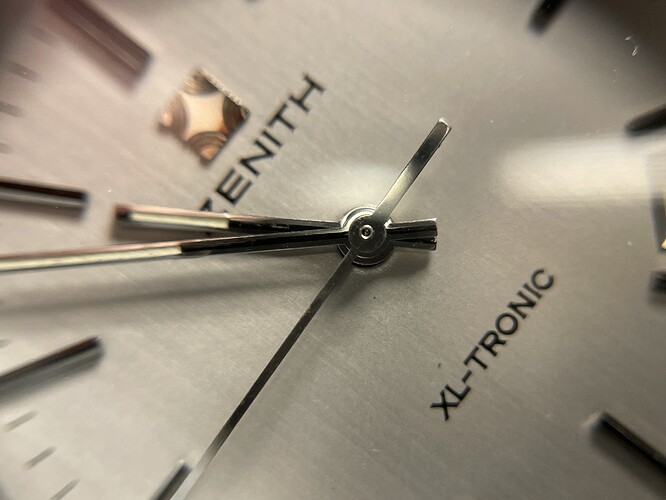 Dit is finesse. In zijn puurste vorm. Een wijzer is bij Zenith geen wijzer. Nee. Dat zijn 2 zorgvuldig geslepen Japanse zwaarden die een diepzwarte gebalanceerde zijdeachtige geul bijeenhouden die op precies de juiste plaats onderbroken wordt door een prachtige strook met gebroken witte, gelumineerde vloeistof die alleen zijn werk doet wanneer het moet en niets meer. Maar zeker ook niets minder. De indices zijn elegant zonder een moment saai te zijn. Dat alleen al. Ik bedoel, ken je dat gevoel dat je tegen jezelf zegt dat iets saai is, maar er wel al 43 seconden naar kijkt. Dan IS het dus niet saai.