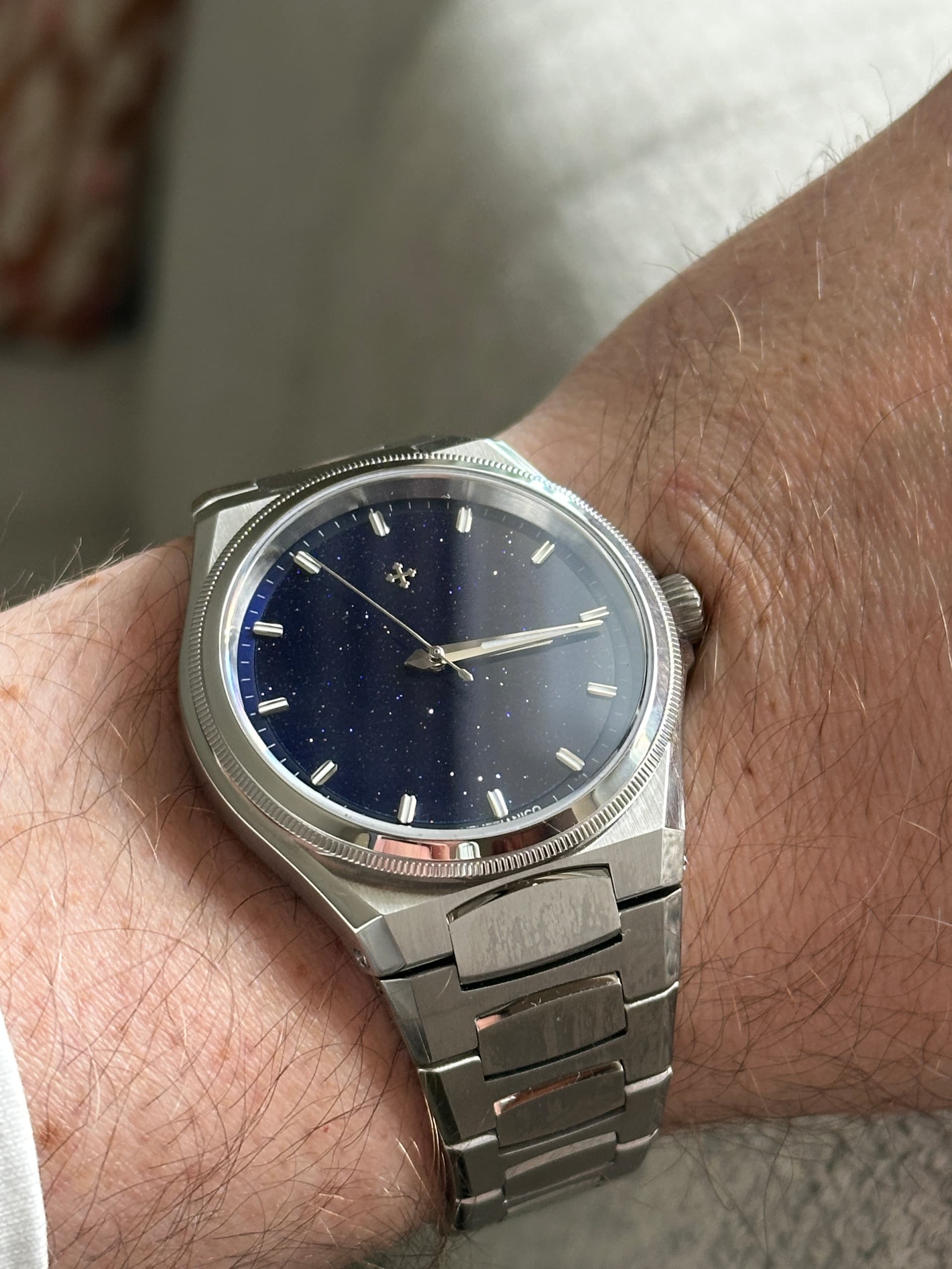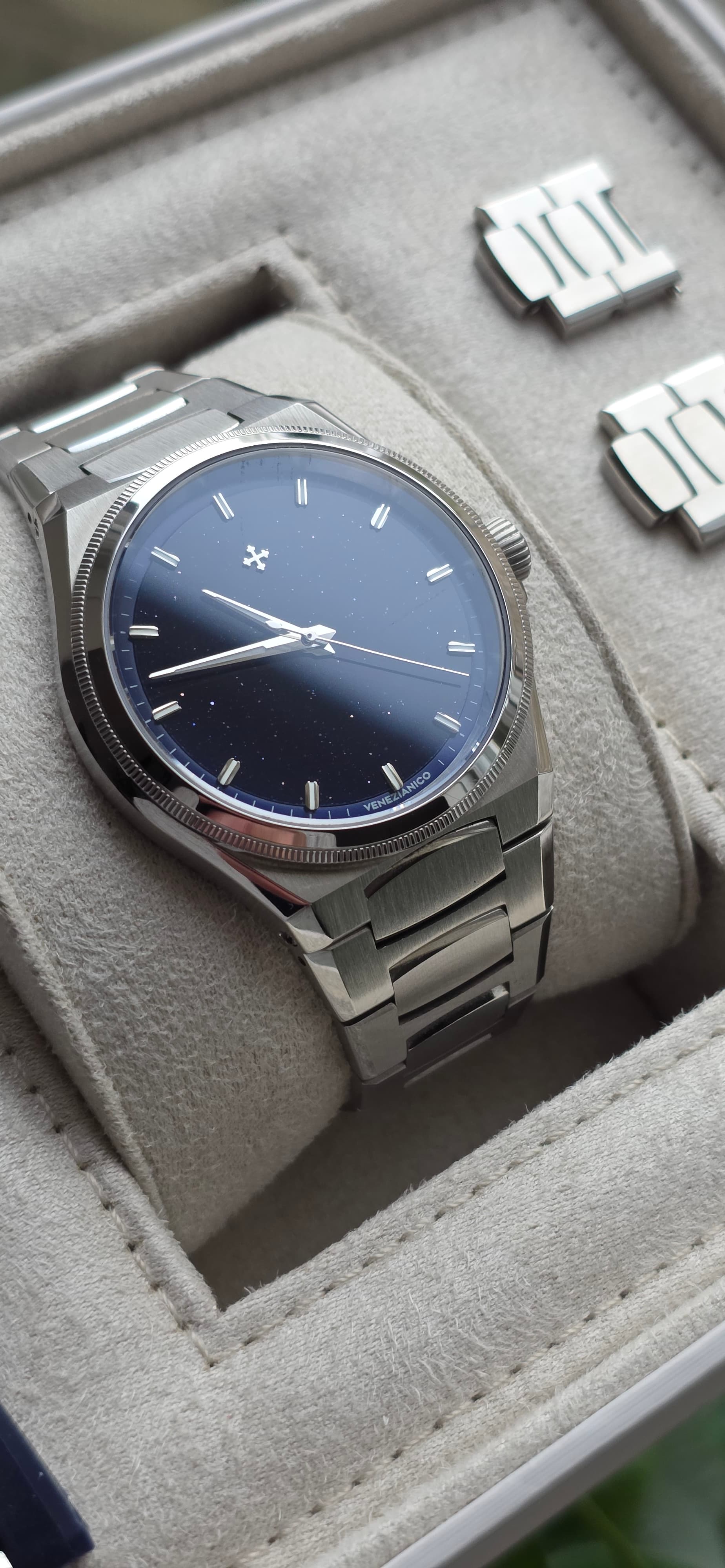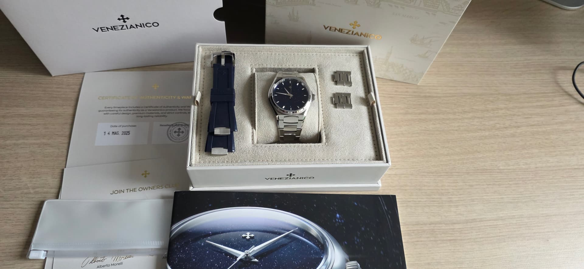 Originele doos en/of eventuele accessoires: Full set plus stalen band. Komt standaard enkel op rubber, deze komt extra met de originele stalen band, half-link en schakels. Stalen band komt gemonteerd, wat echt een drama is om te doen.