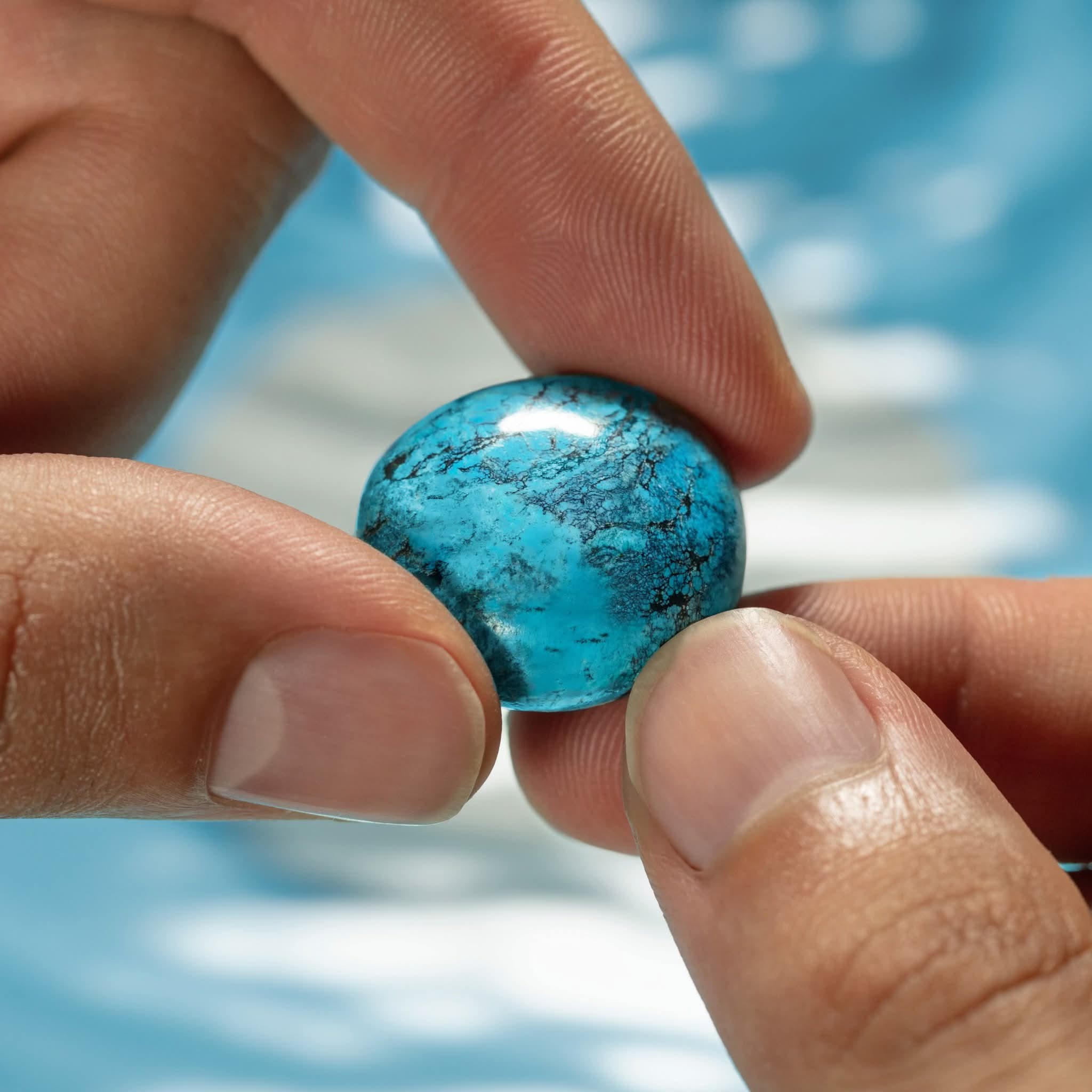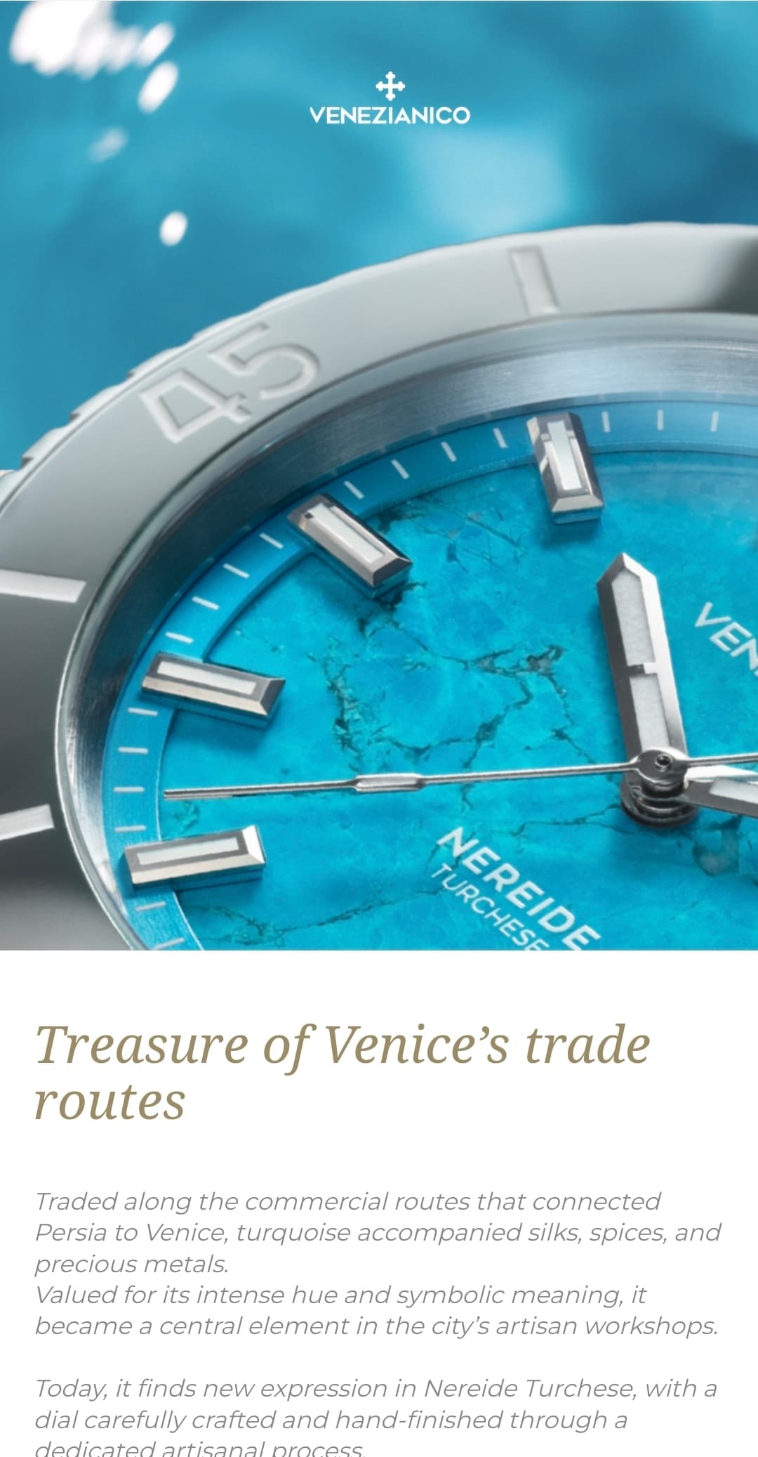 Deze steen, die de essentie van water vastlegt, reist al eeuwen langs oude handelsroutes, van het hart van Perzië tot de Venetiaanse lagune, betoverende kooplieden en reizigers met tinten variërend van hemelblauw tot zeegroen, doet denken aan de reflecties van onze lagune.