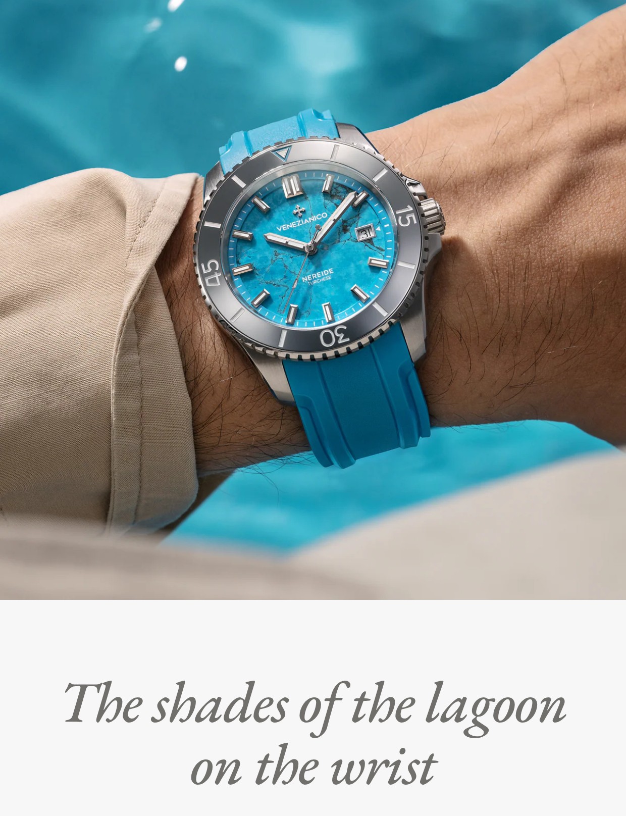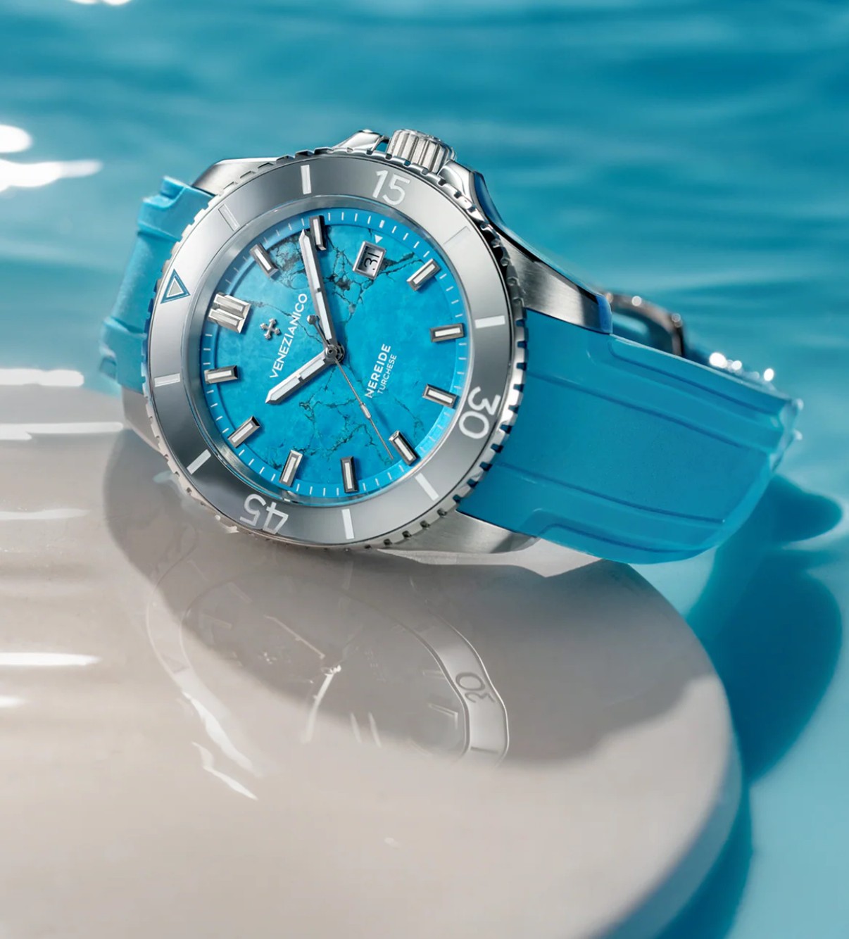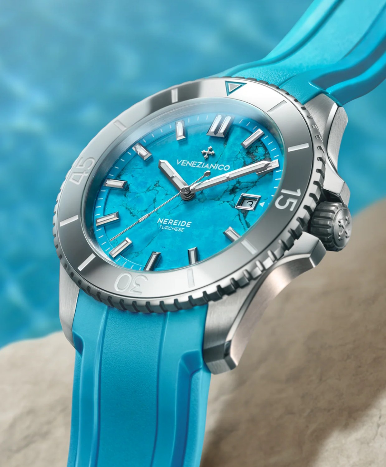 Dial in genuine natural turquoise, hand-finished to enhance its unique veins and color variations.Swiss Made automatic movement Sellita SW200-1, caseback engraved with the Nereide submarine.42 mm case, tungsten bezel and Made in Italy rubber strap, chromatically aligned with the dial.