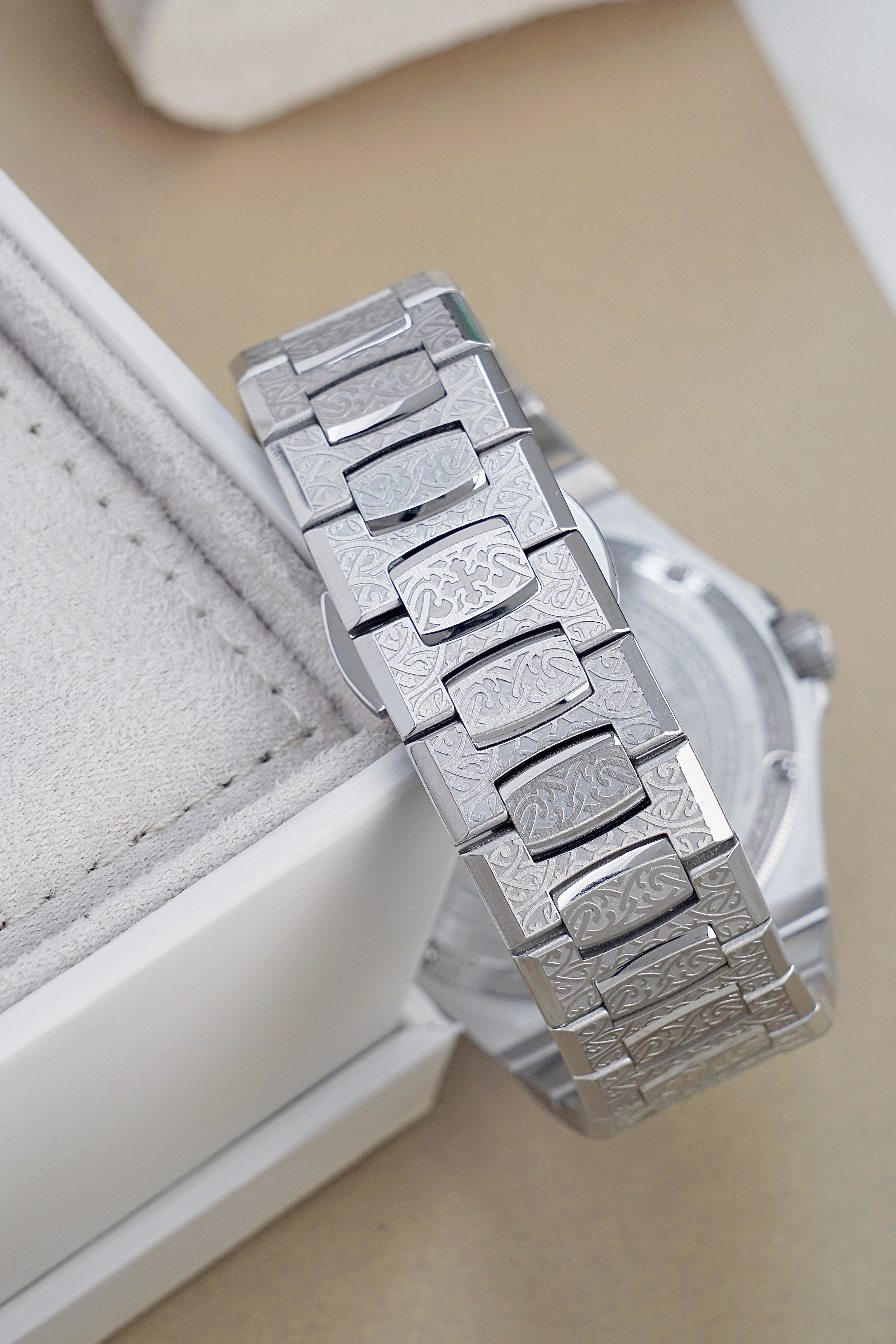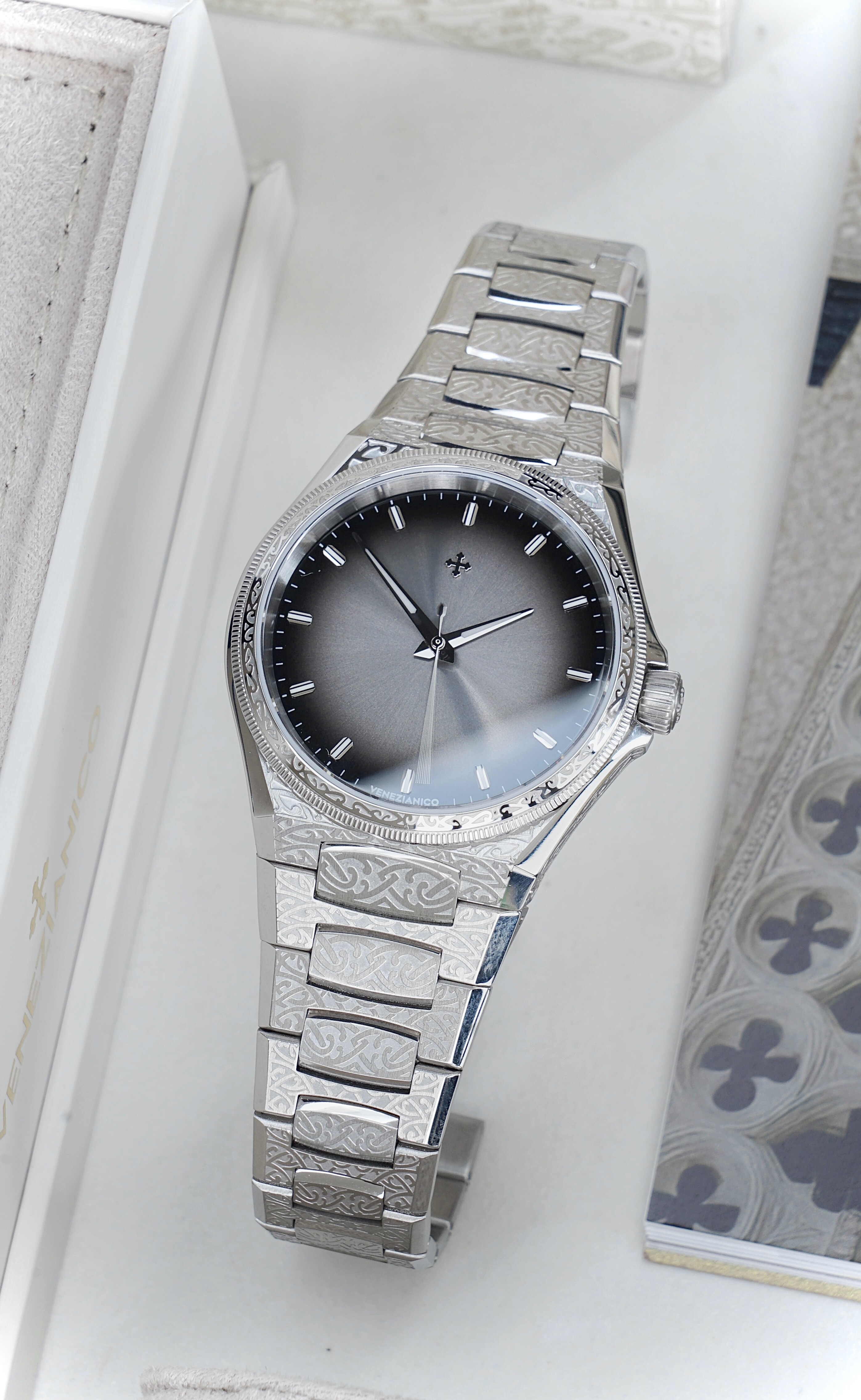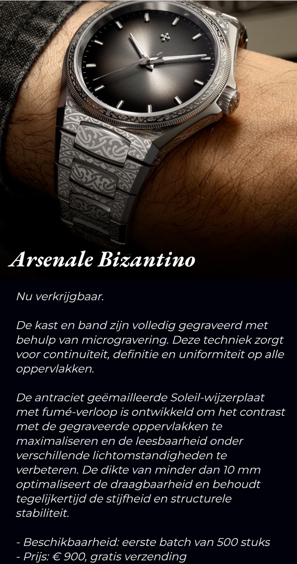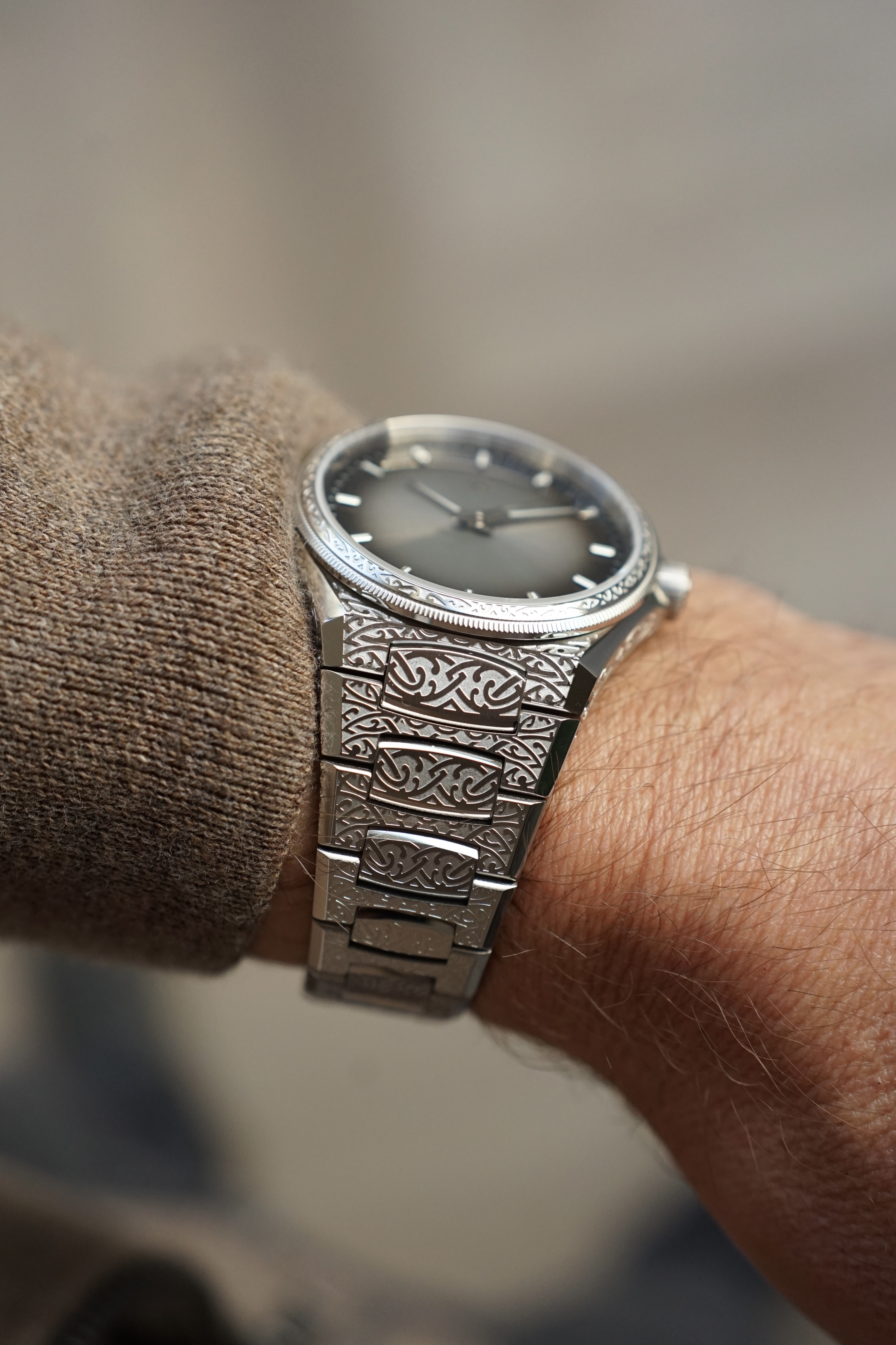 . De wijzerplaat is erg tof gedaan, soort van sunburst waardoor deze precies genoeg opvalt tussen de drukte van de gravures.