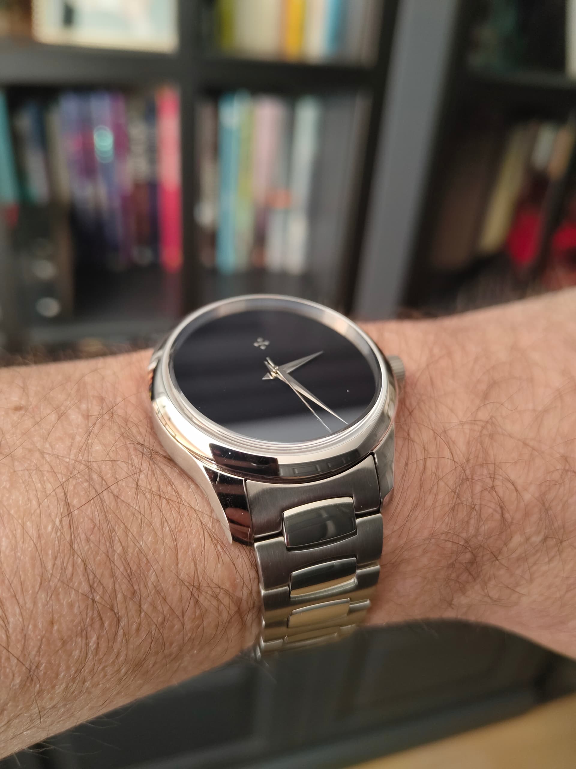 Ik heb mijn ultrablack op de Canova band gezet, dat vind ik er al beter uitzien dan de originele band die er bij zat maar veel draagtijd krijgt hij echter niet bij mij. Ik vind hem iets te dik voor een dresswatch.