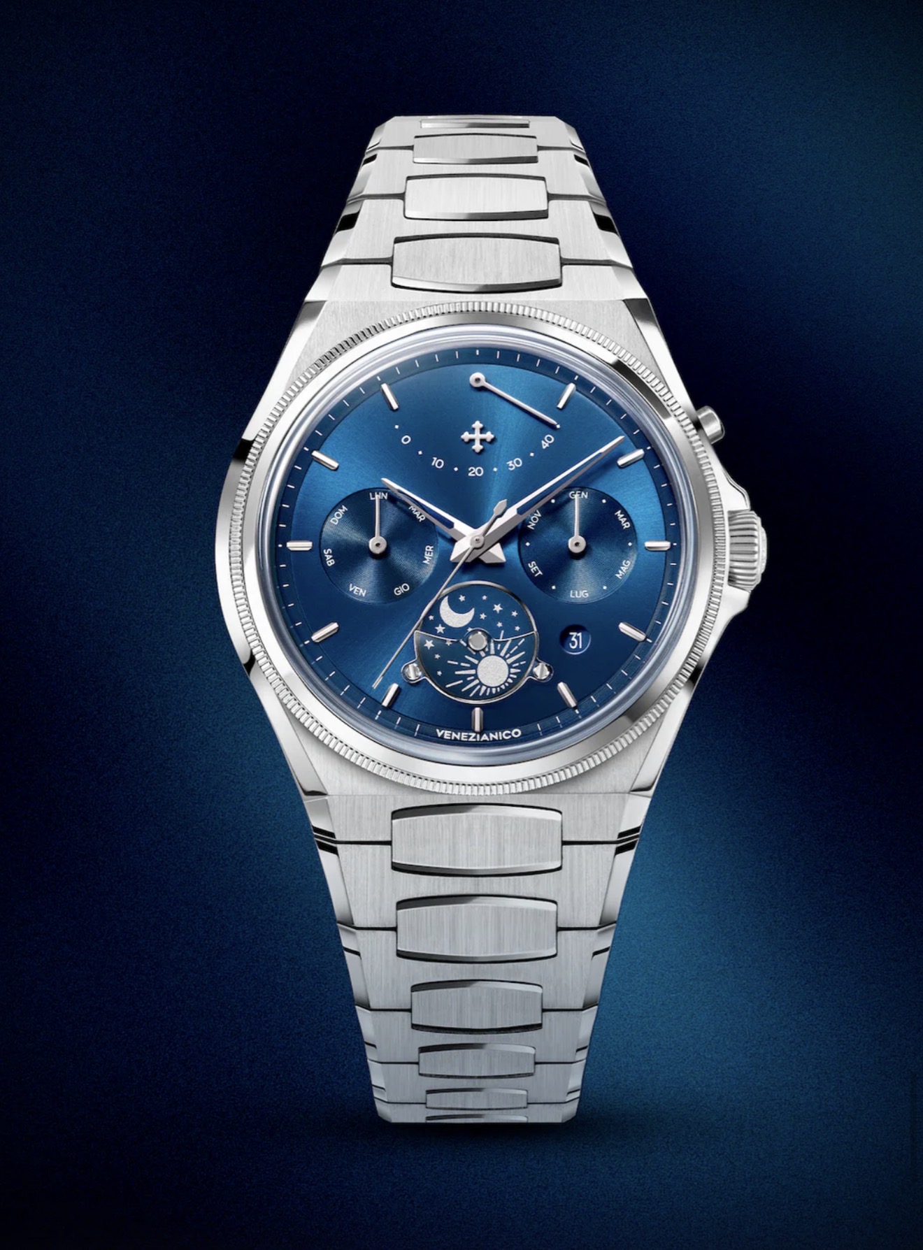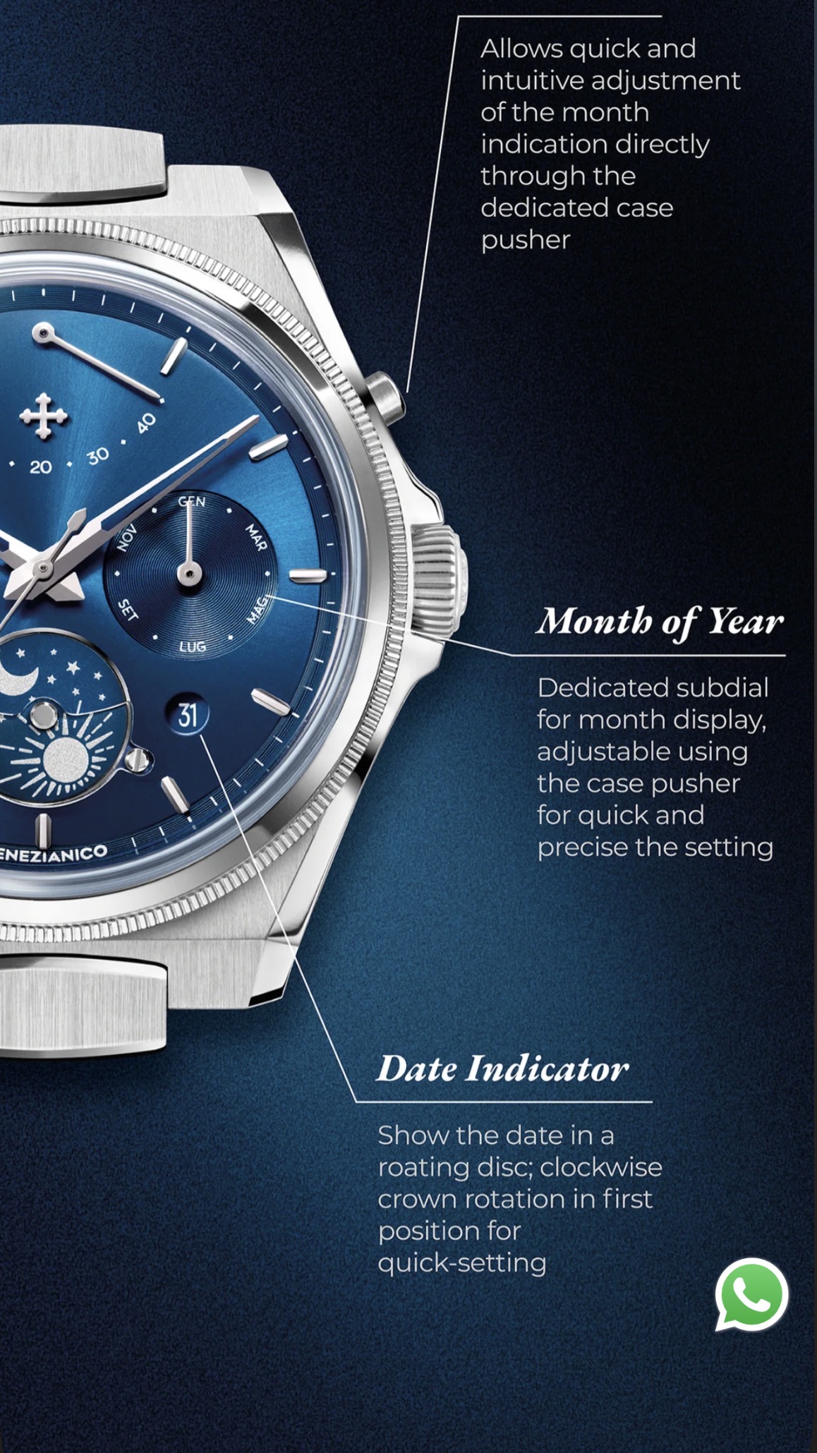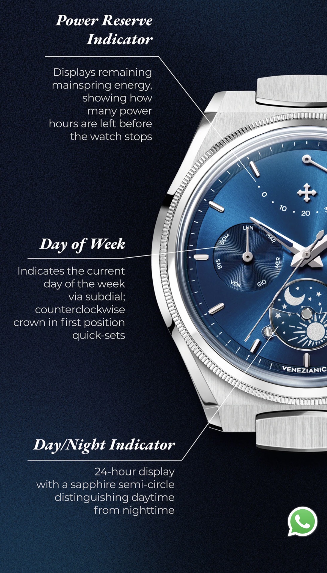 Day, date, month, power reserve en dag/nacht weergave. Best cool.