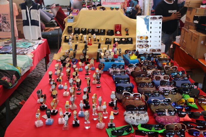 Vandaag op een rommelmarkt in Esposende geweest, en warempel ook wat klokjes gespot. Nu ben ik niet zo bekend met kleine of oudere merken, maar zag als bekend voorkomende namen naast Omega en Tissot ook Geneva en Timex liggen. Die ene Tissot was zwaar gehavend en wilde men nog € 220 voor hebben.