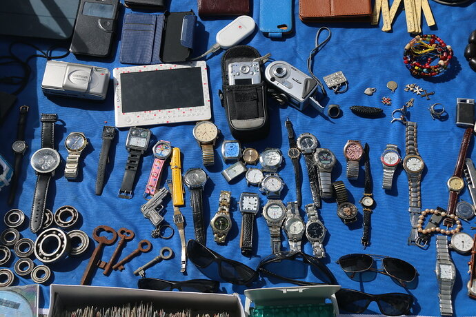 Ook wel gelachen. Bij 1 kraam lag tussen allerlei prullaria een ‘Rolex’ voor € 50. Die werd door een ‘kenner’ geïnspecteerd met een plastic loupje zoals je uit een kauwgomballenapparaat kon draaien. Na lang wikken en wegen heeft hij die gekocht, helaas geen foto van kunnen maken.