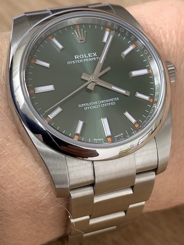 Te groot. Voor een charmante vrouwenpols is 34mm bij Rolex wel de max vind ik. Anders wordt het wat mij betreft opzichtig. (Briljant mannenhorloge trouwens