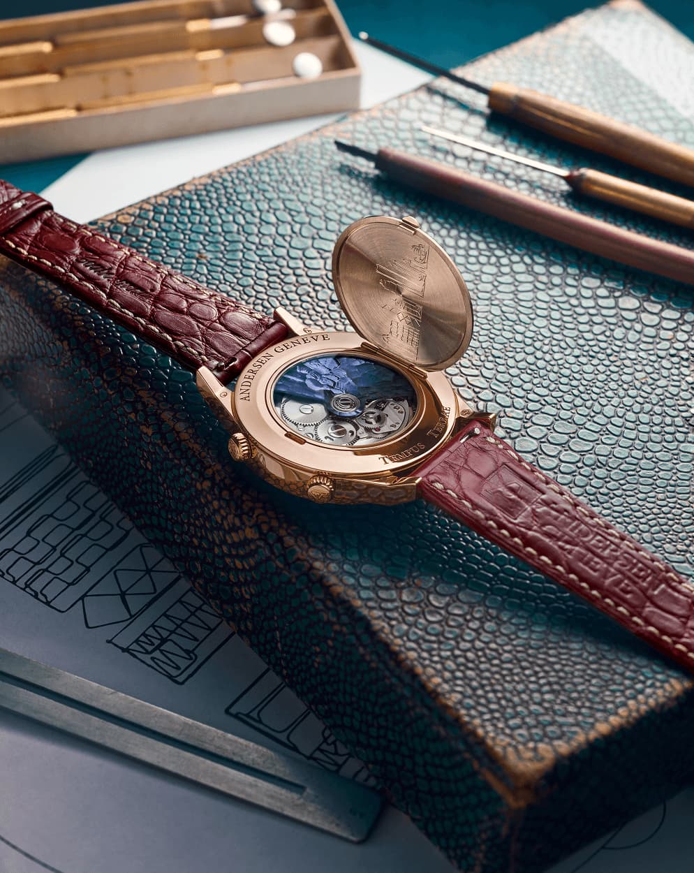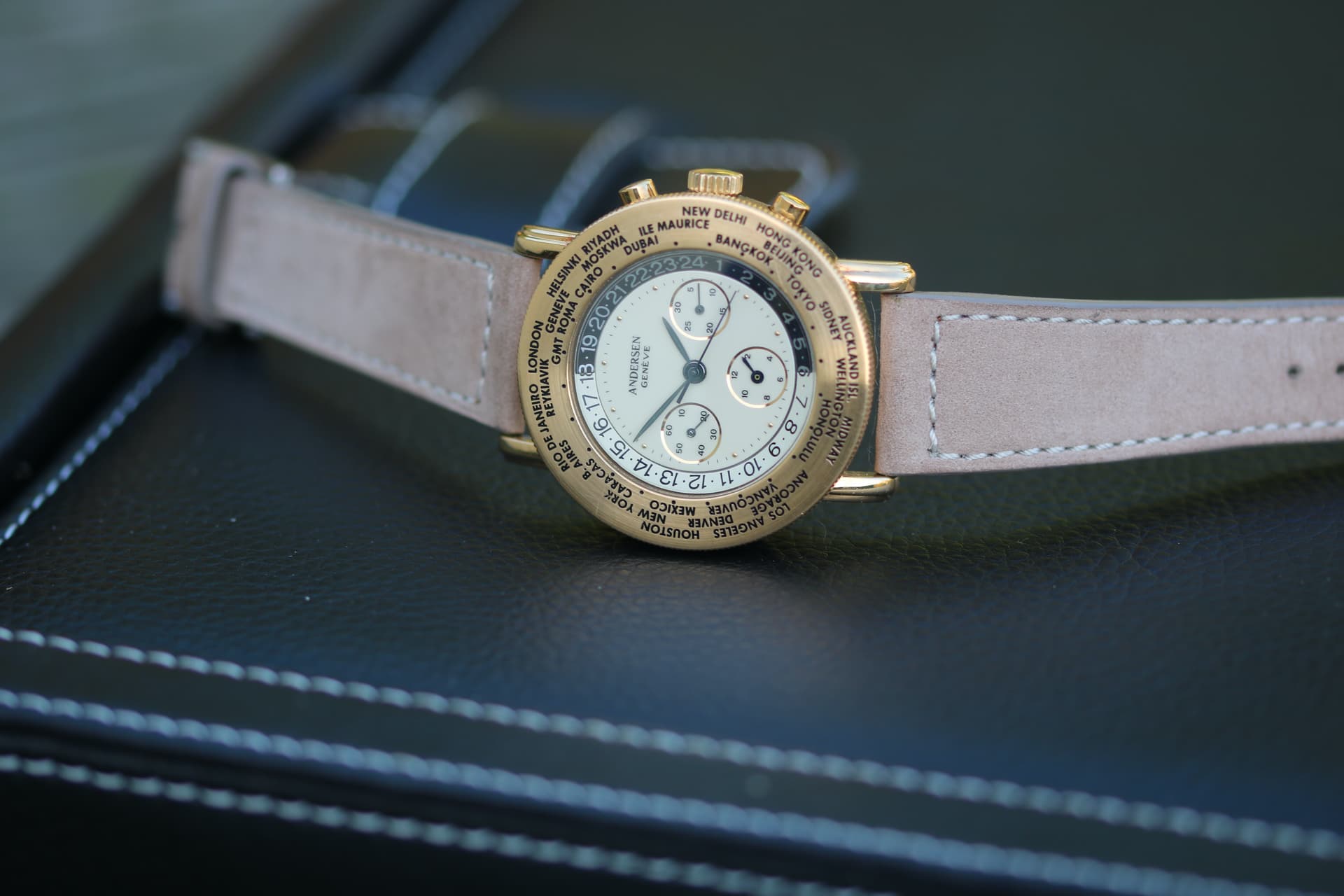 De chronograaf is gebaseerd op een Lemania-uurwerk, waarop Andersen opnieuw zijn eigen Worldtimer-module heeft toegevoegd.