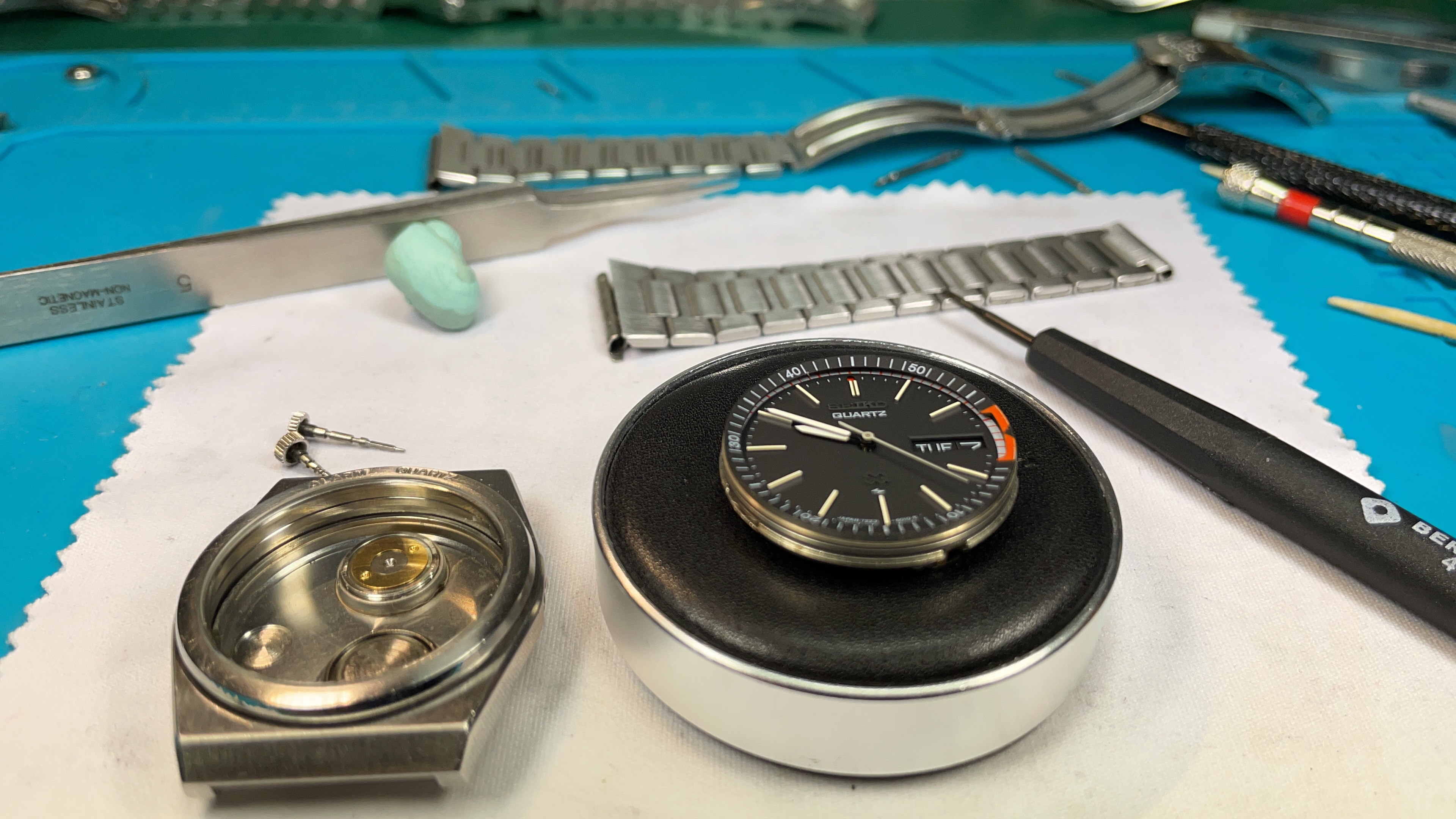 In het kort: Dagen mee bezig geweest .kast polijsten, brushen, donor kopen, wijzerplaat, wijzers, alarm bezel en uiteindelijk zelfs de ‘coil’overgezet… Niet om het horloge als nieuw te maken, maar juist om het op te frissen voor de komende 25 jaar…