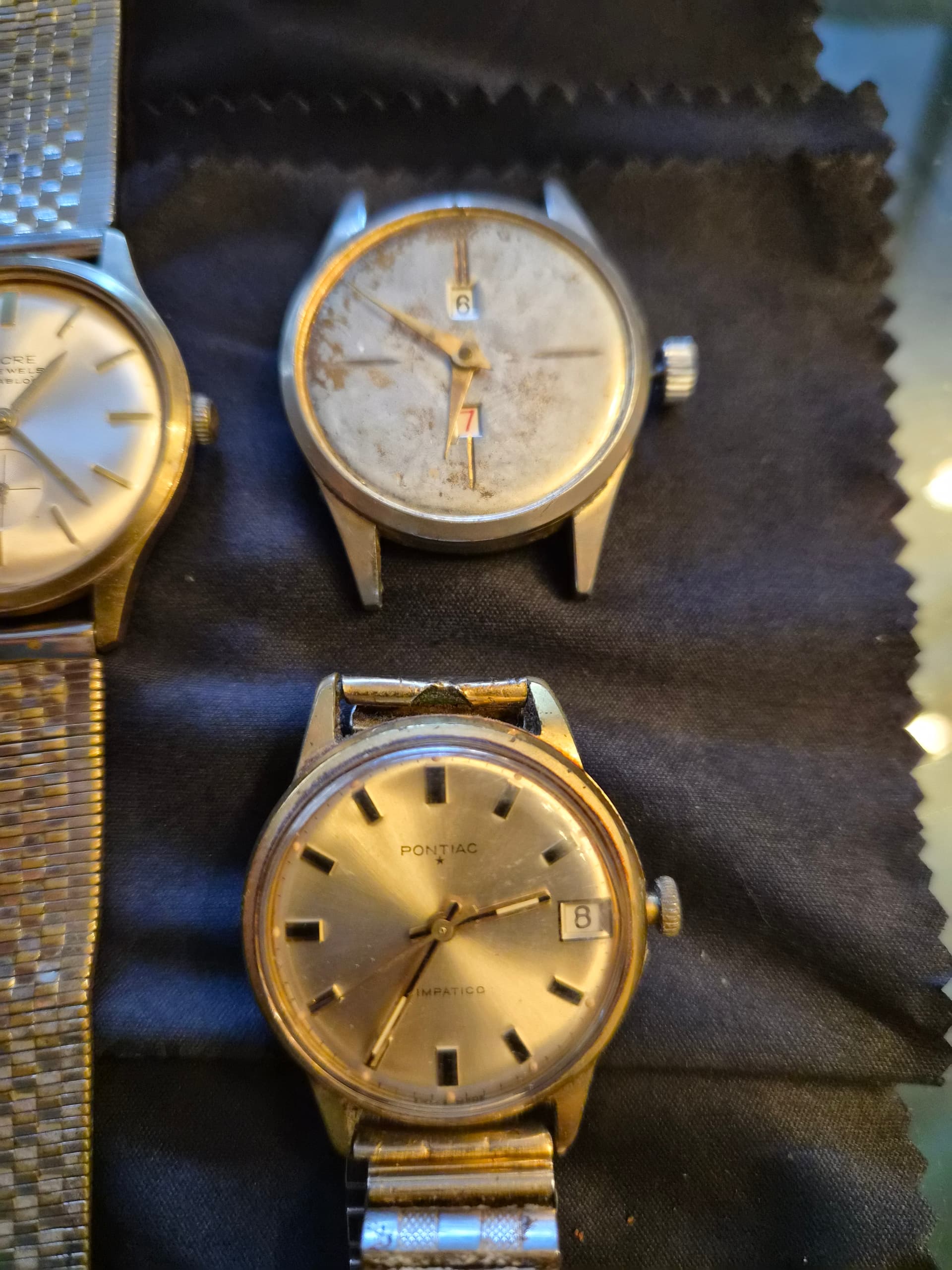 Uhm tsja het zijn allemaal zwaar gehavende horloges, welke bijna allemaal budgetkwaliteit waren toen ze nieuw waren. De Pontiac is het “beste” maar heeft een verbogen kastpoot.