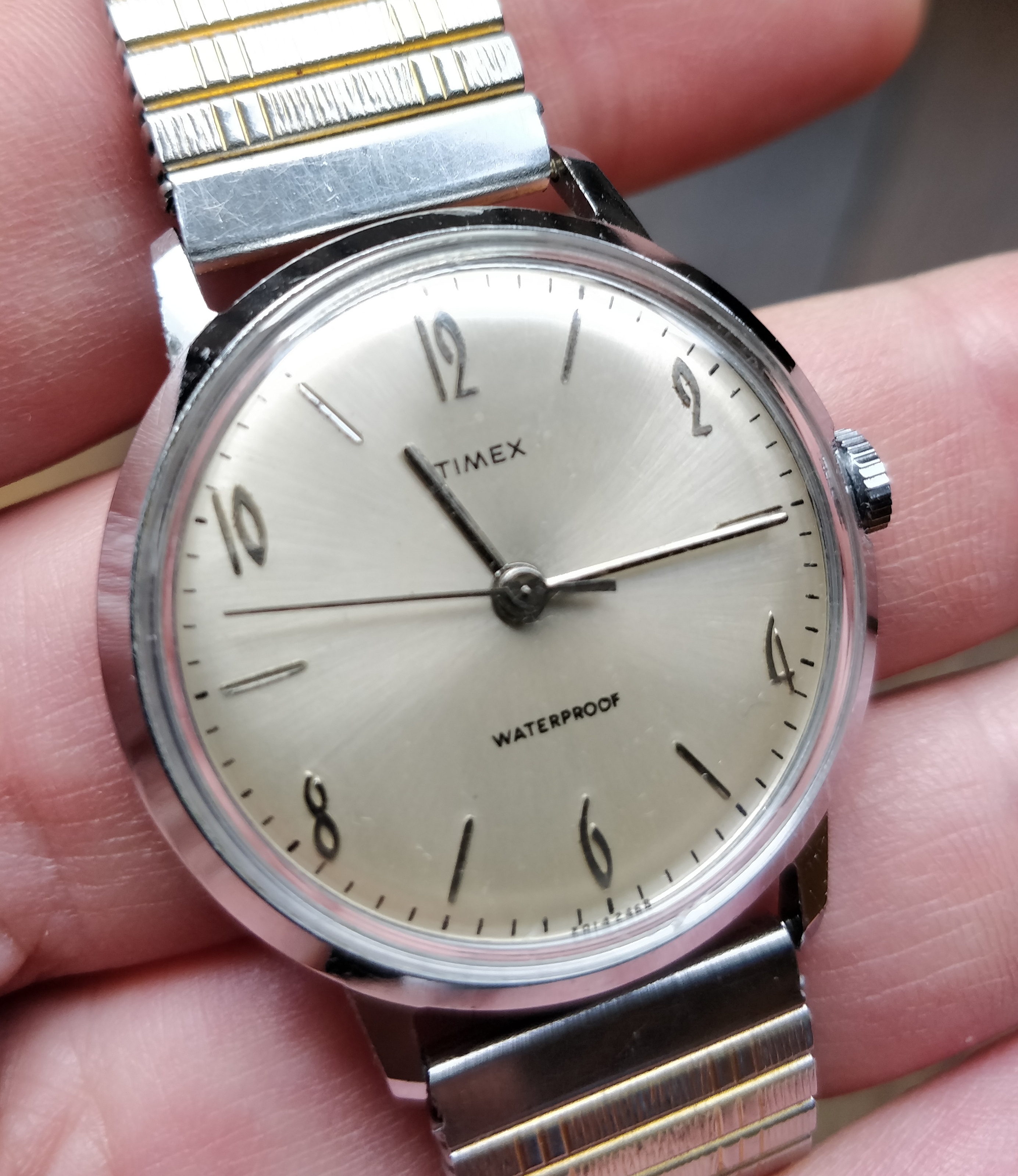 Geen haute horlogerie, maar de Timex Marlin is een leuke vintage instapper. Ik heb een vintage exemplaar met champagnekleurige plaat. Die vind ik zo leuk dat ik de re-issue in blauw erbij heb genomen.