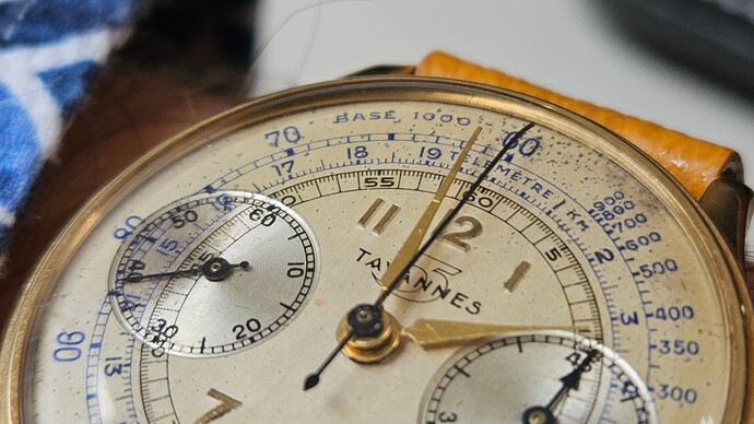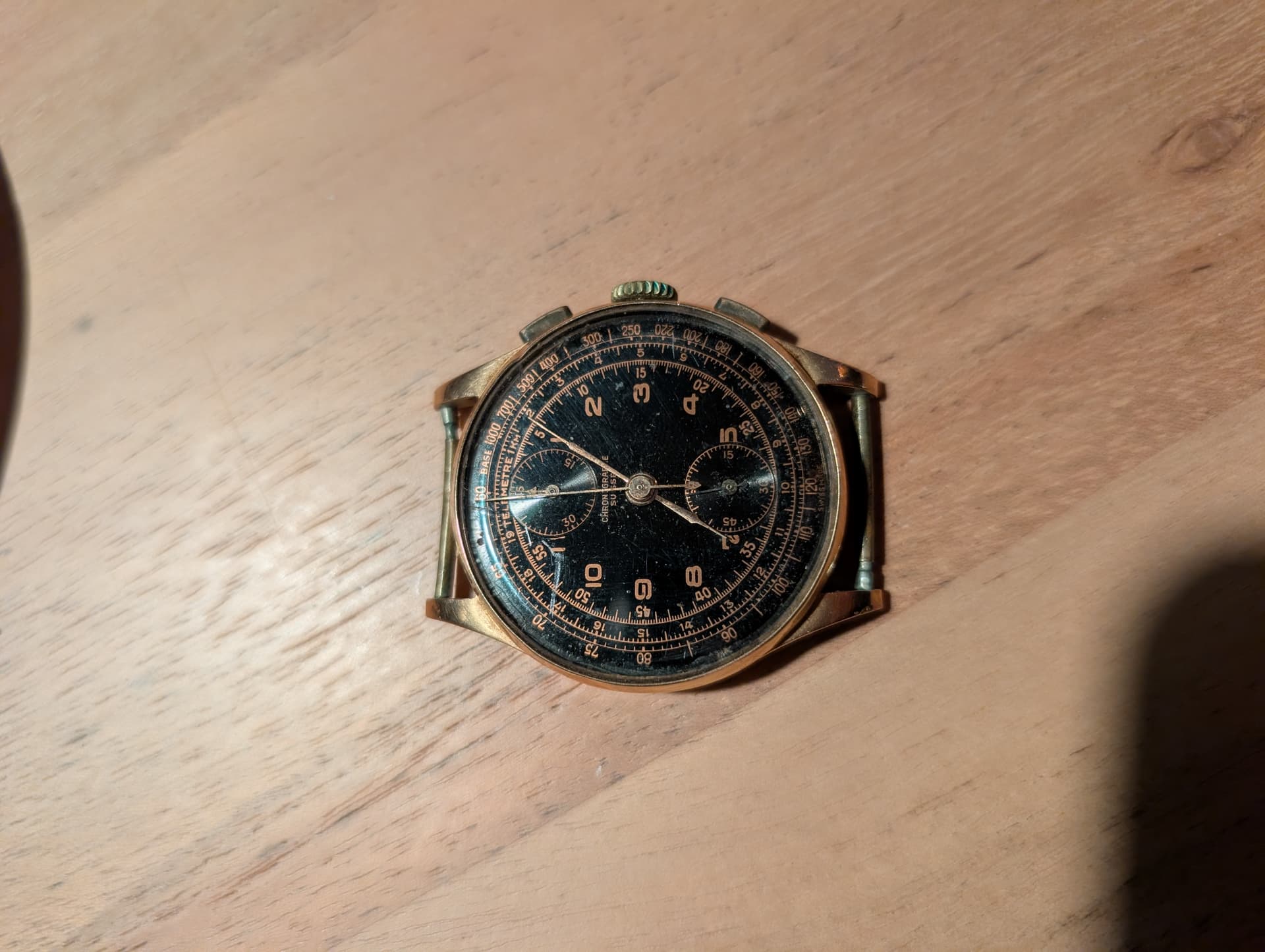 Het binnenwerk moet al bijna een Venus 170 zijn. Ik ken geen andere 1940s chrono types met de subdials op 12 en 6. 18k goud, zwarte wijzerplaat, vrij ongewoon binnenwerk, en zo op het eerste zicht in cosmetisch prima staat voor z’n leeftijd - zeker de wijzerplaat, die is heel goed bewaard gebleven - knap hoor.