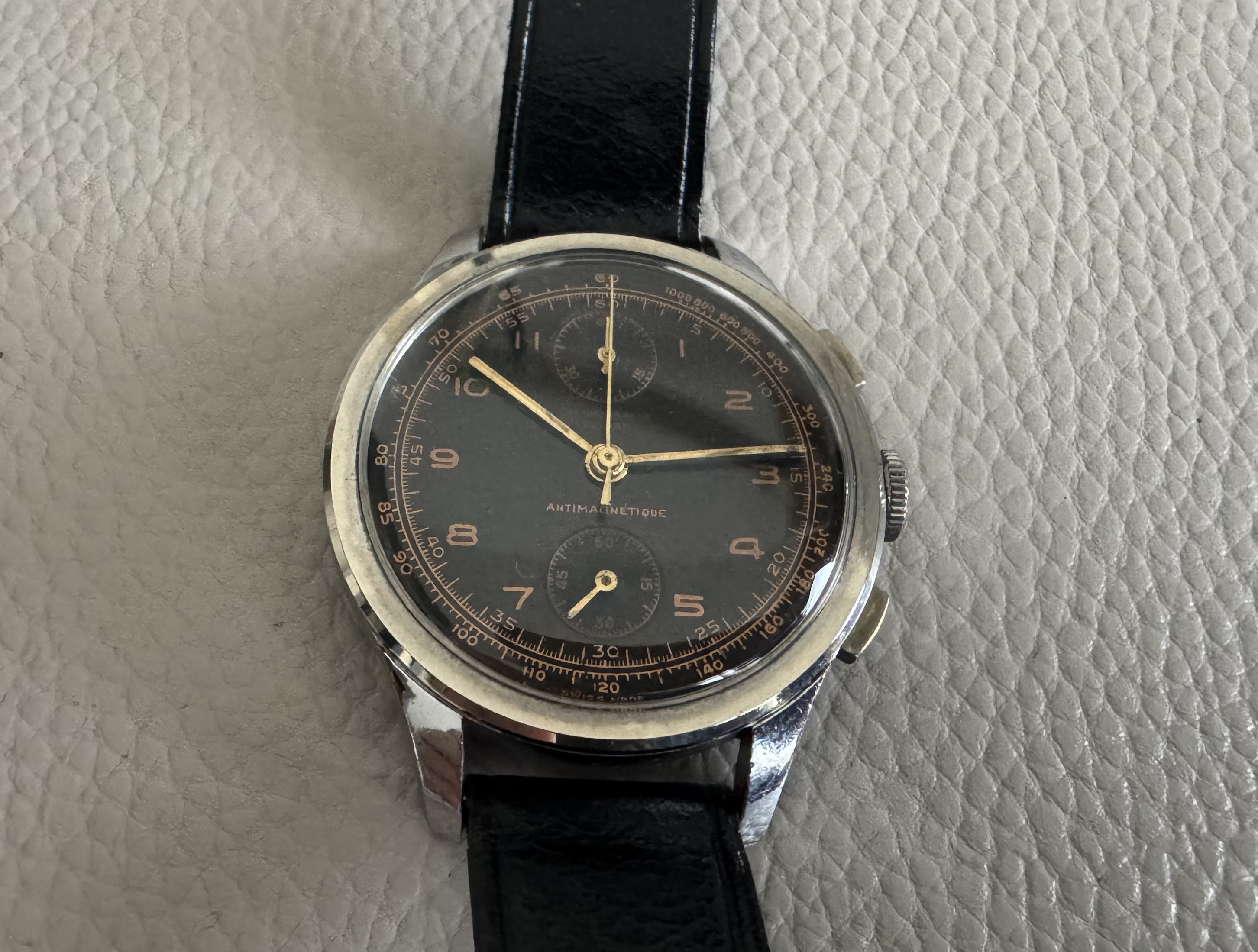Klopt, veel dateren moet je niet proberen aan een Chronographe Suisse. Aan de stijl te zien zou ik op de jaren 40 mikken ergens maar het blijft een buikgevoel.