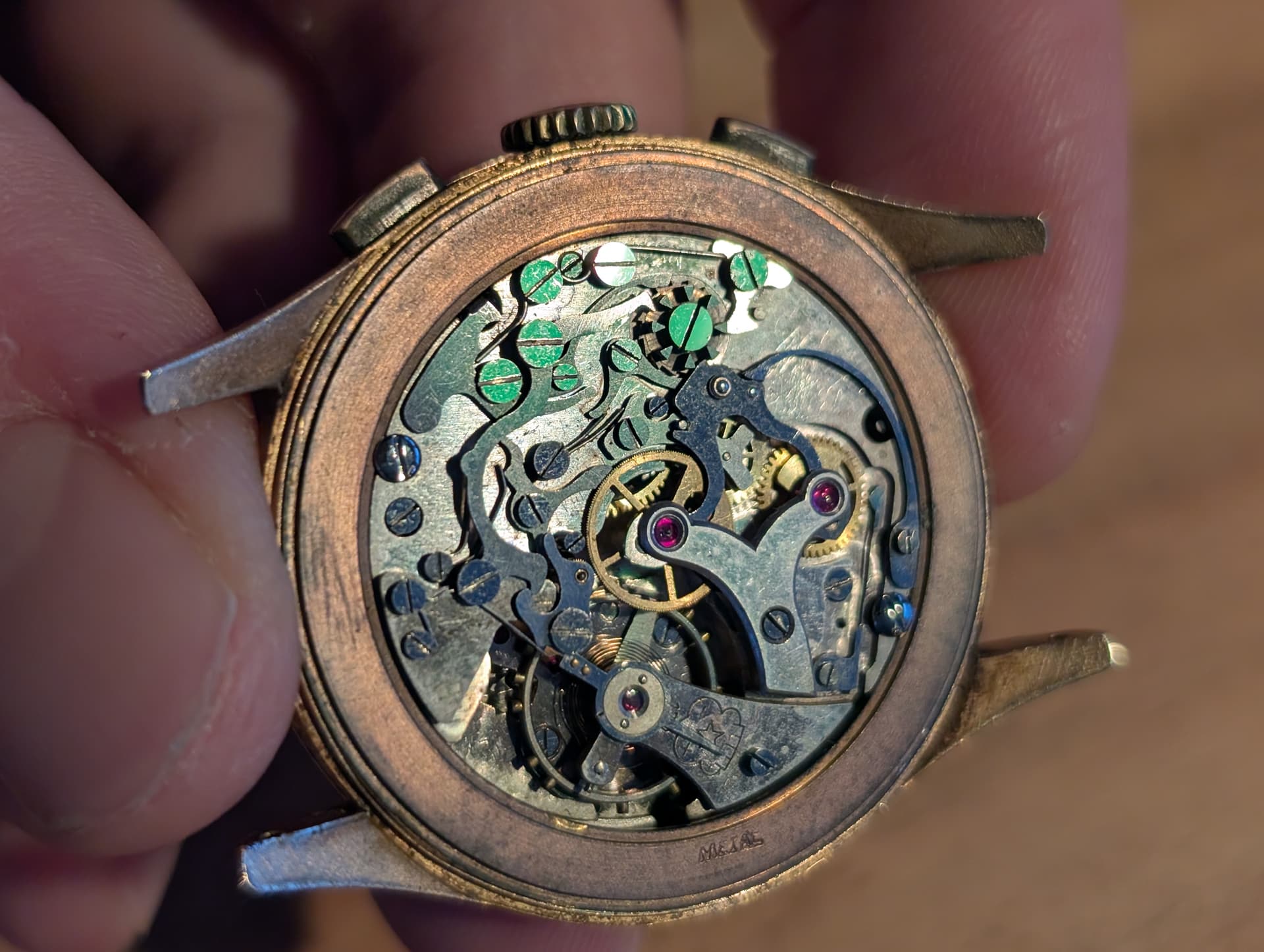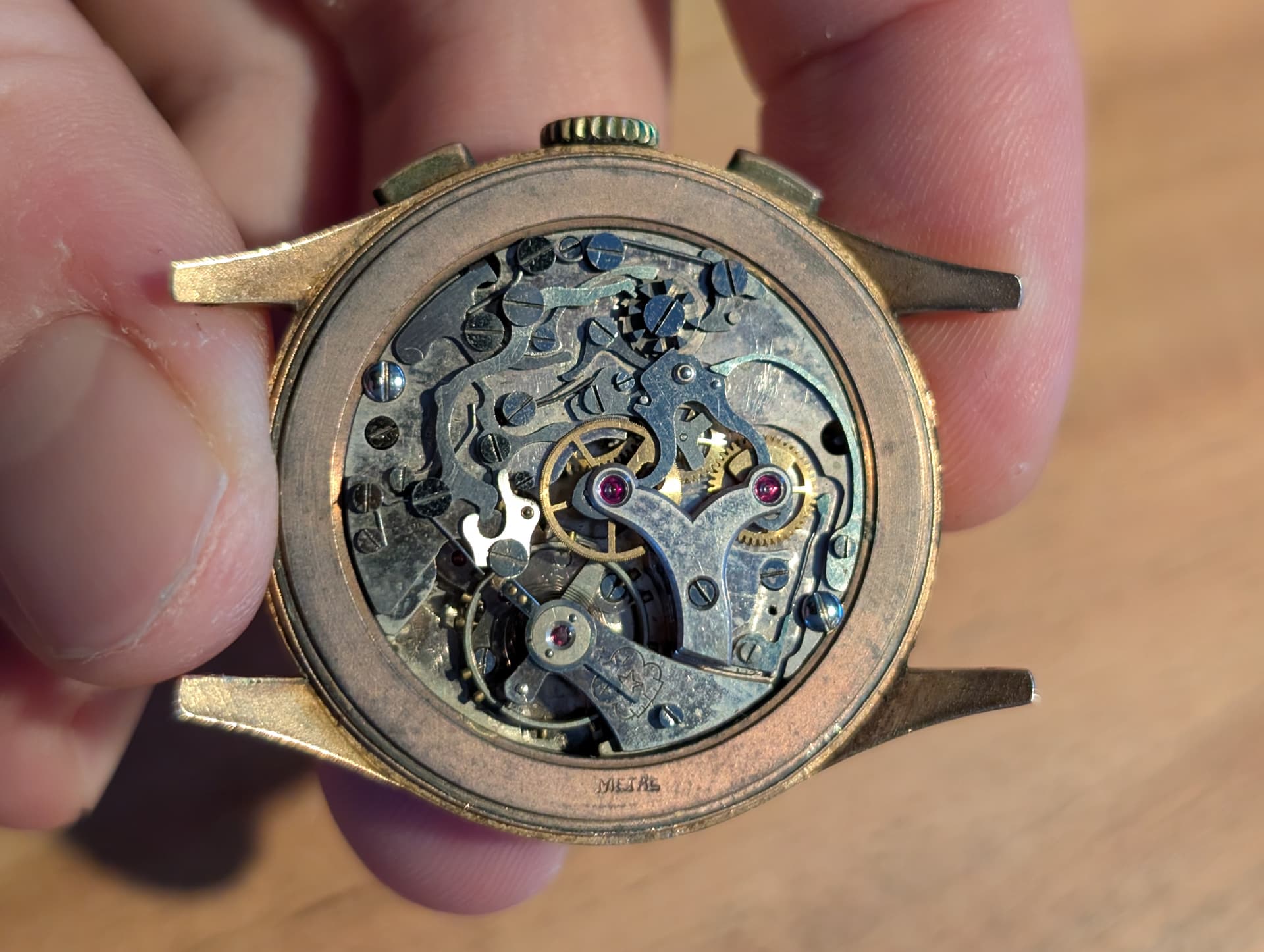 Leuke oude chronograaf jaren 50. In ieder geval kast gemaakt van 18k goud. Gebruikelijk in die tijd. Vermoedelijk inwendig een Landeron of Venus uurwerk. Maar dan zal hij toch echt open moeten voor duidelijkheid. Zeker de moeite om na te laten kijken. Mooi bandje erop en dragen. Succes ermee.