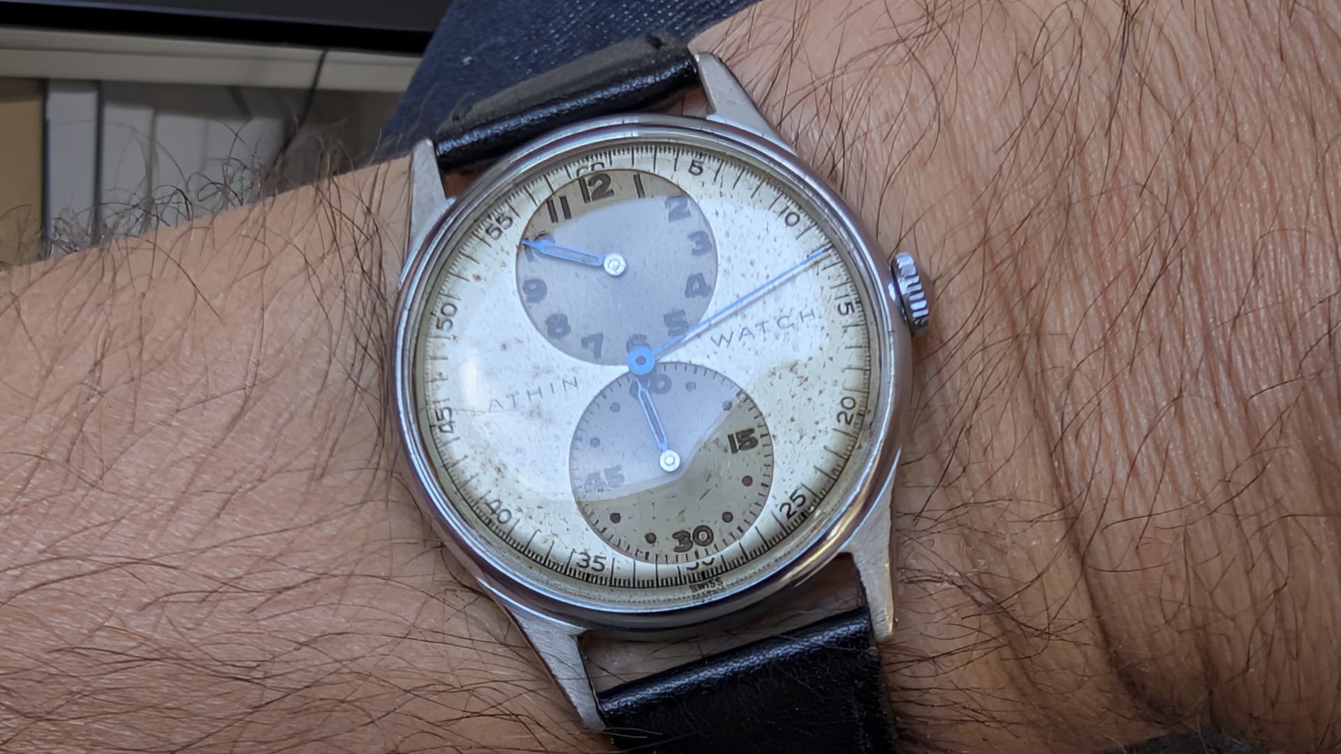 Nogal hoog ja. Ik zit ook met twijfels over die wijzerplaat, de verkleuring is wat vreemd. Zou ik eerder verwachten bij een radium horloge, maar dat is met deze indices niet van toepassing.