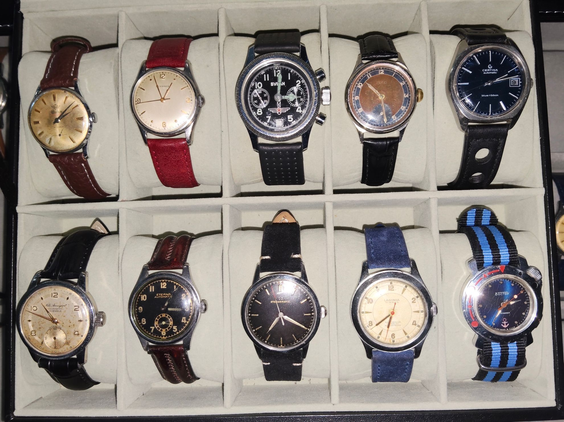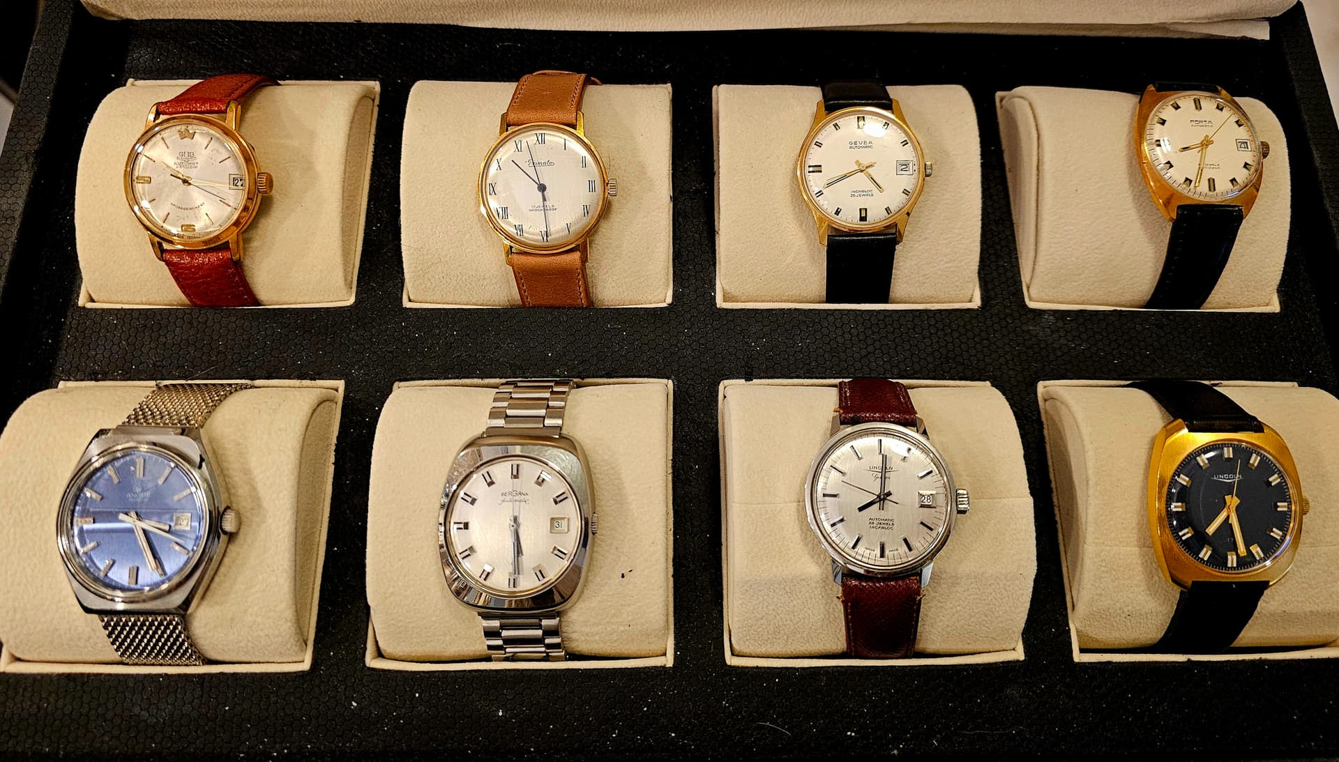 Tien verschillende stukken, elk met hun eigen verhaal en charme — van elegante jaren ’50 dresswatches tot stoerdere modellen uit de jaren ’60 en ’70.
