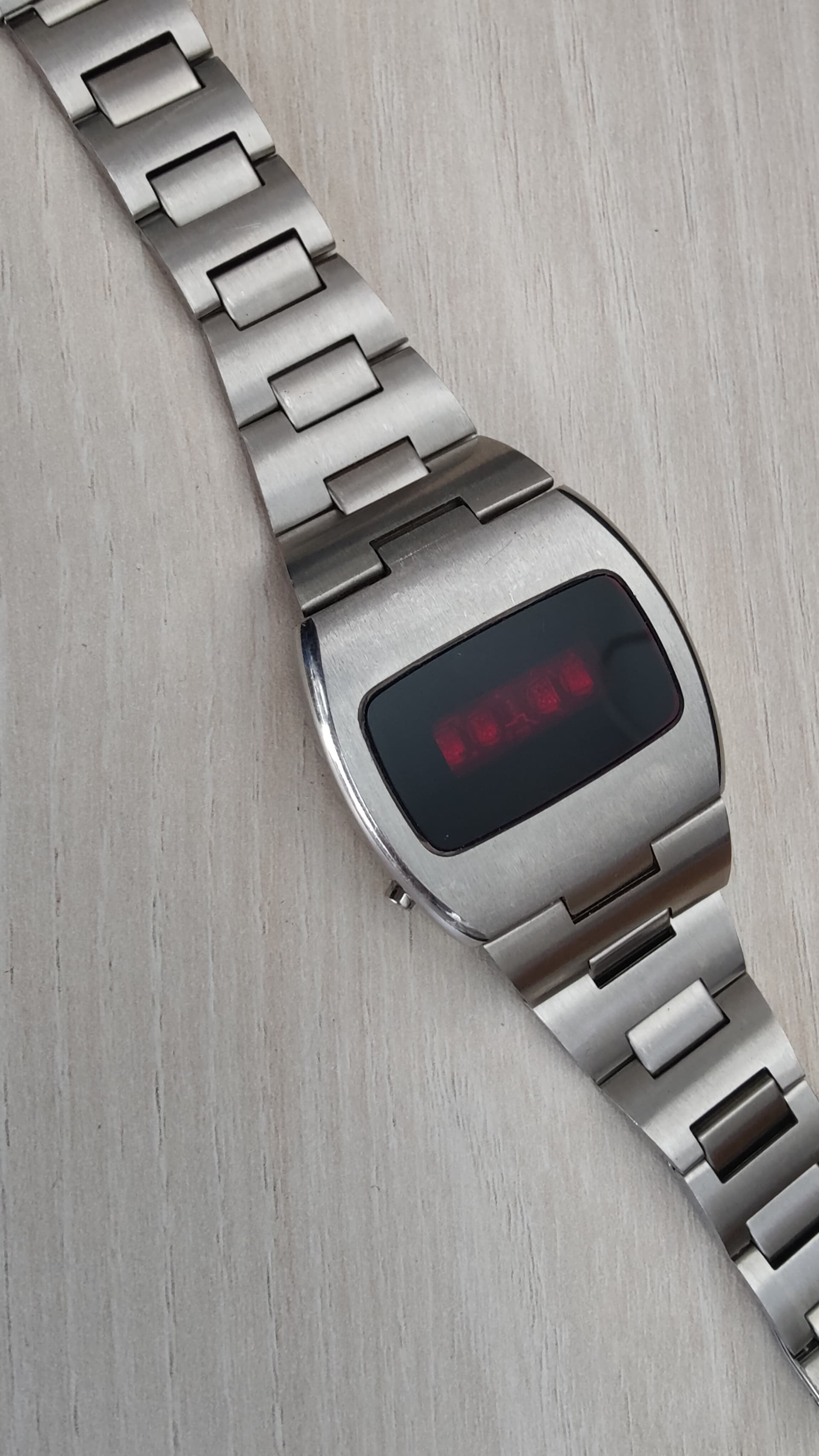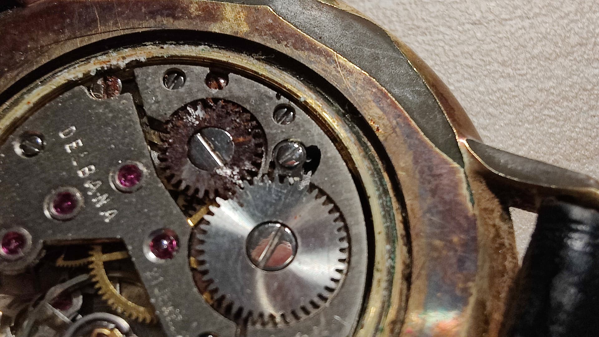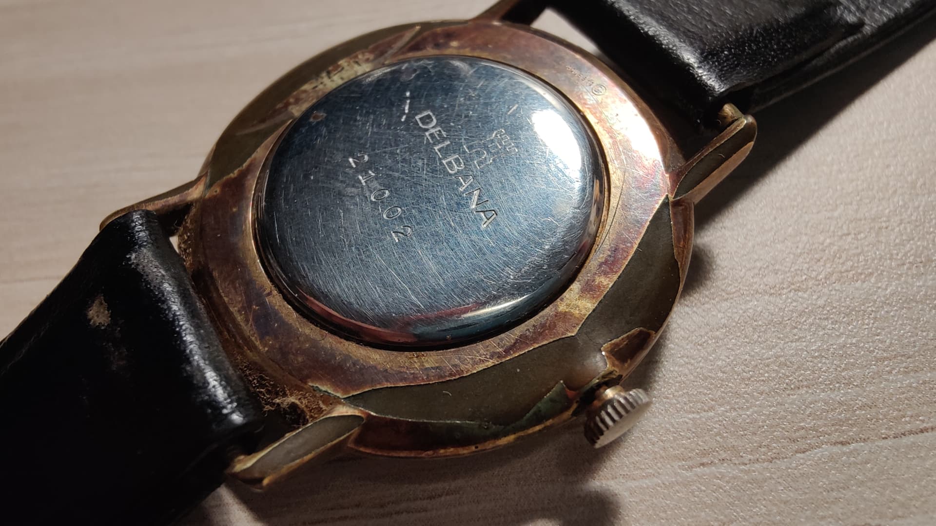 Tot slot nog een Delbana. Het verhaal is dat mijn oom, die vroeger een groente zaak had, deze lang geleden heeft gekregen van een bananenhandelaar en echt vele vele jaren als dagelijks horloge heeft gedragen. En dat is te zien, aan echt alles. De kroon zit muurvast, het schroefje om de kroon los te maken brak af en er is duidelijk roest in het uurwerk te zien. Zou leuk zijn als ik deze weer werkend kan krijgen.