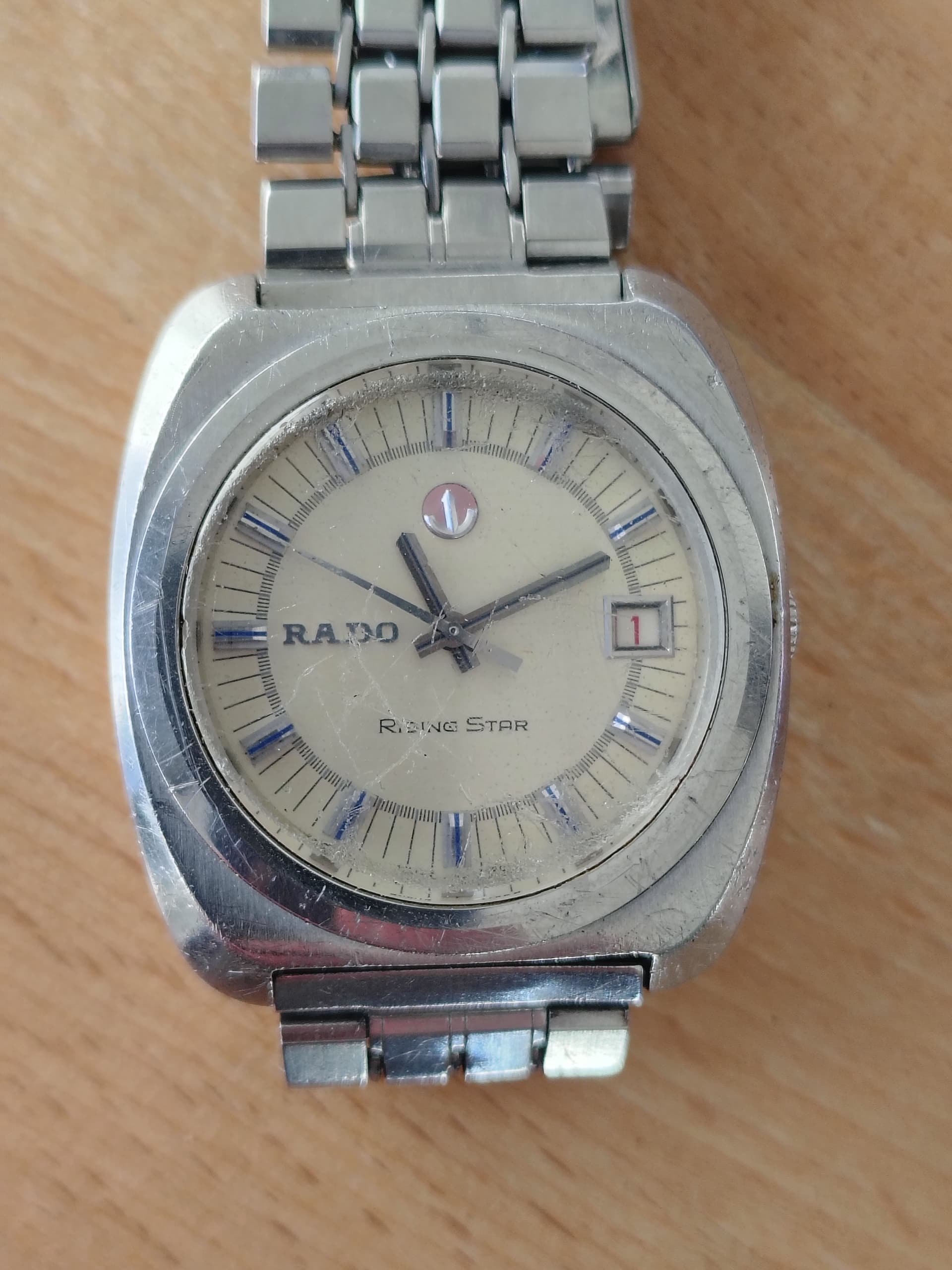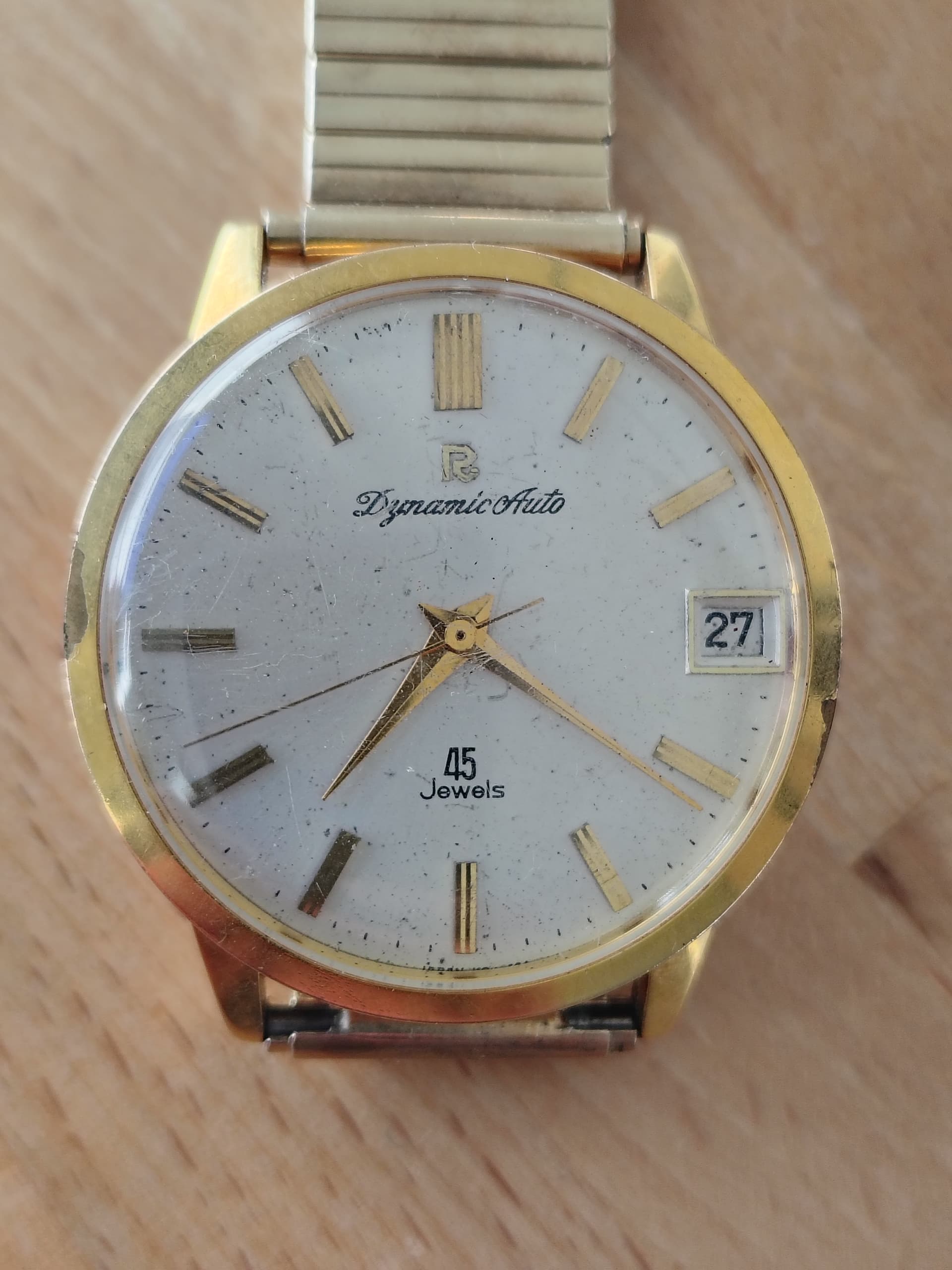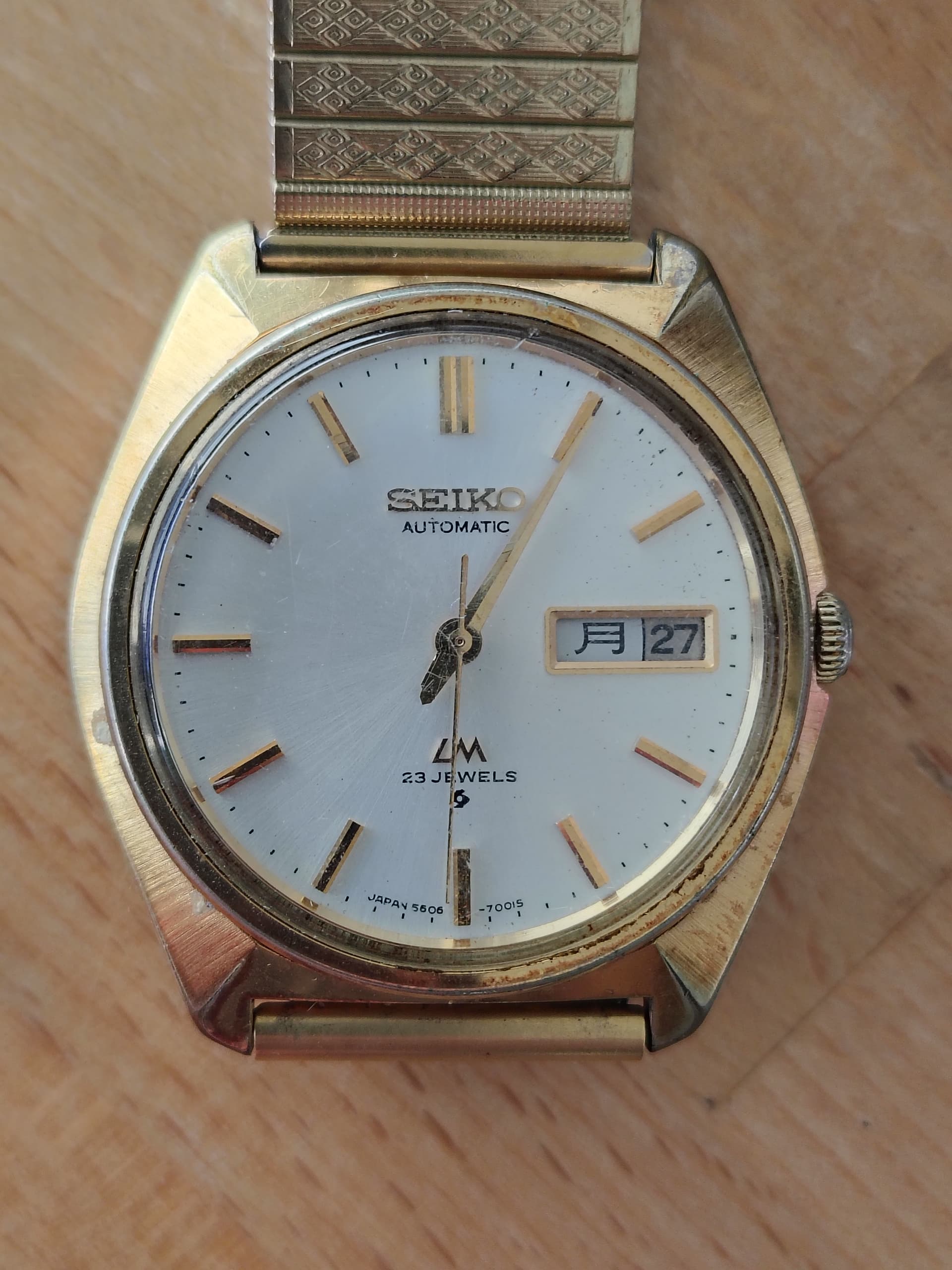 Zo, hij is binnen, blijkt een Seiko 7025-8120-P, met een charmante vergulde rvs kast, waarin een glas half los zat, met stof op de wijzerplaat en een verbogen secondewijzer. De rotor zat zo los dat hij niet meer opwond. Het bandje is erg afgesleten.