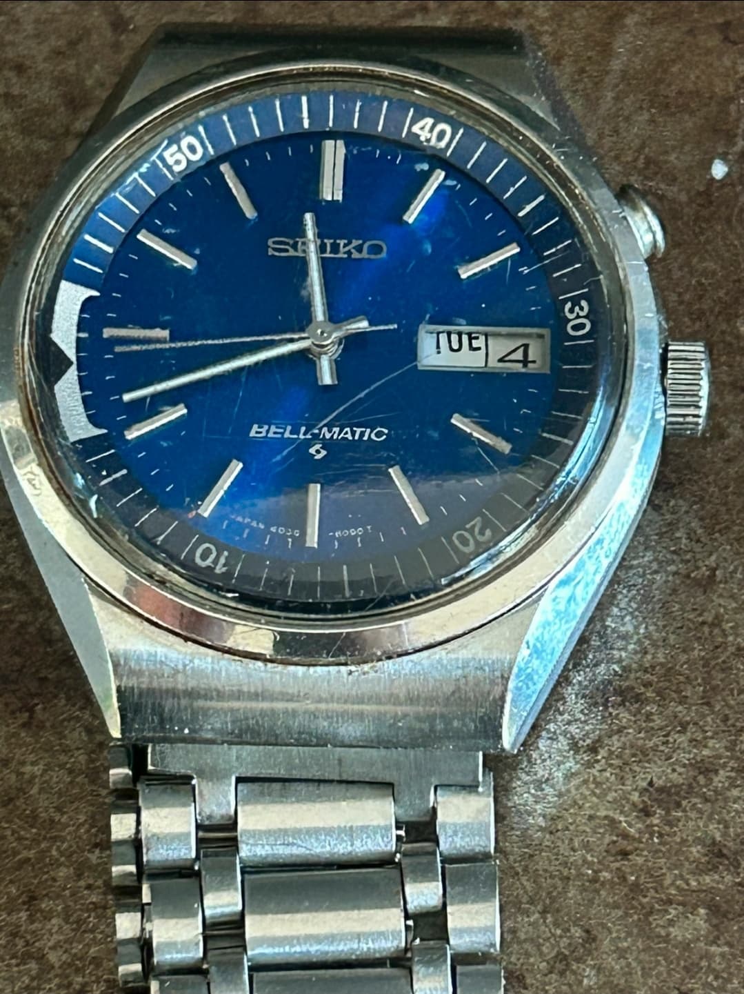 Foto verkoper. Ik heb de euvele moed genomen een tweede Bell-Matic aan te kopen om op te knappen, een mooie blauwe die ik nog niet eerder had gezien. Hopelijk kan ik het glas mooi polijsten of anders vervangen, en daaronder lijkt hij nog heel mooi.