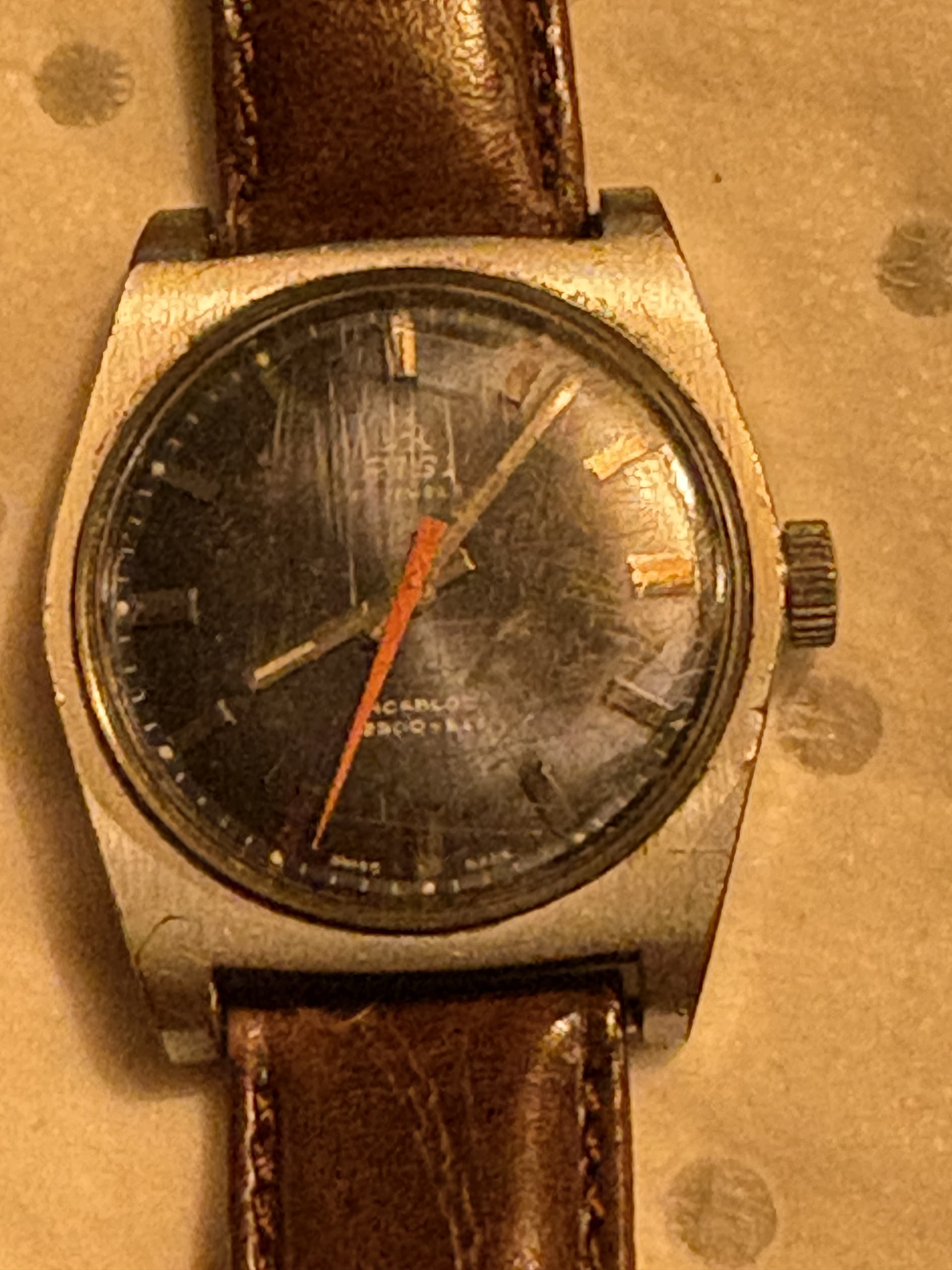Maar er zijn meerdere problemen mee: de uurwijzer draait niet mee, datum snelverzet werkt niet, en in plaats daarvan lijken de beide wijzers tegen elkaar in te willen draaien. Werk aan de winkel dus, maar ik denk dat hij erg mooi is, met een grote grijze rustige wijzerplaat. Water proof op de achterkant, dus van voor 1971.