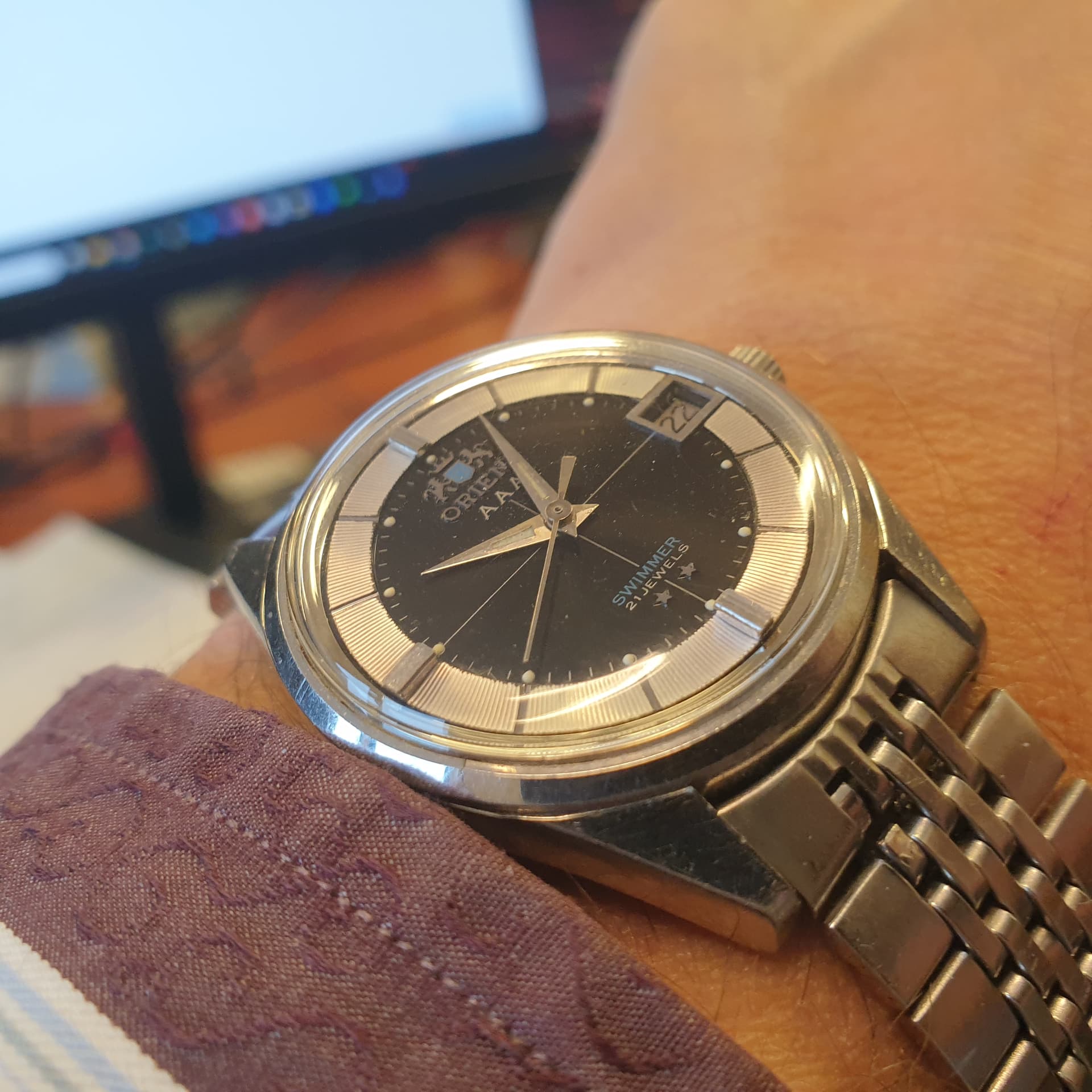 Het glas heeft langs de rand enkele kleine barstjes, maar ik ga het gewoon schuren en polijsten. En de kast is vies, mag in de ultrasoon, en het uurwerkje krijgt een service, maar heeft op het eerste gezicht geen problemen, alle functies werken. Met stevige nieuwe bandpennen gaan de endlinks ook weer mooi zitten verwacht ik. Een blijver, dat weet ik zeker!![]()