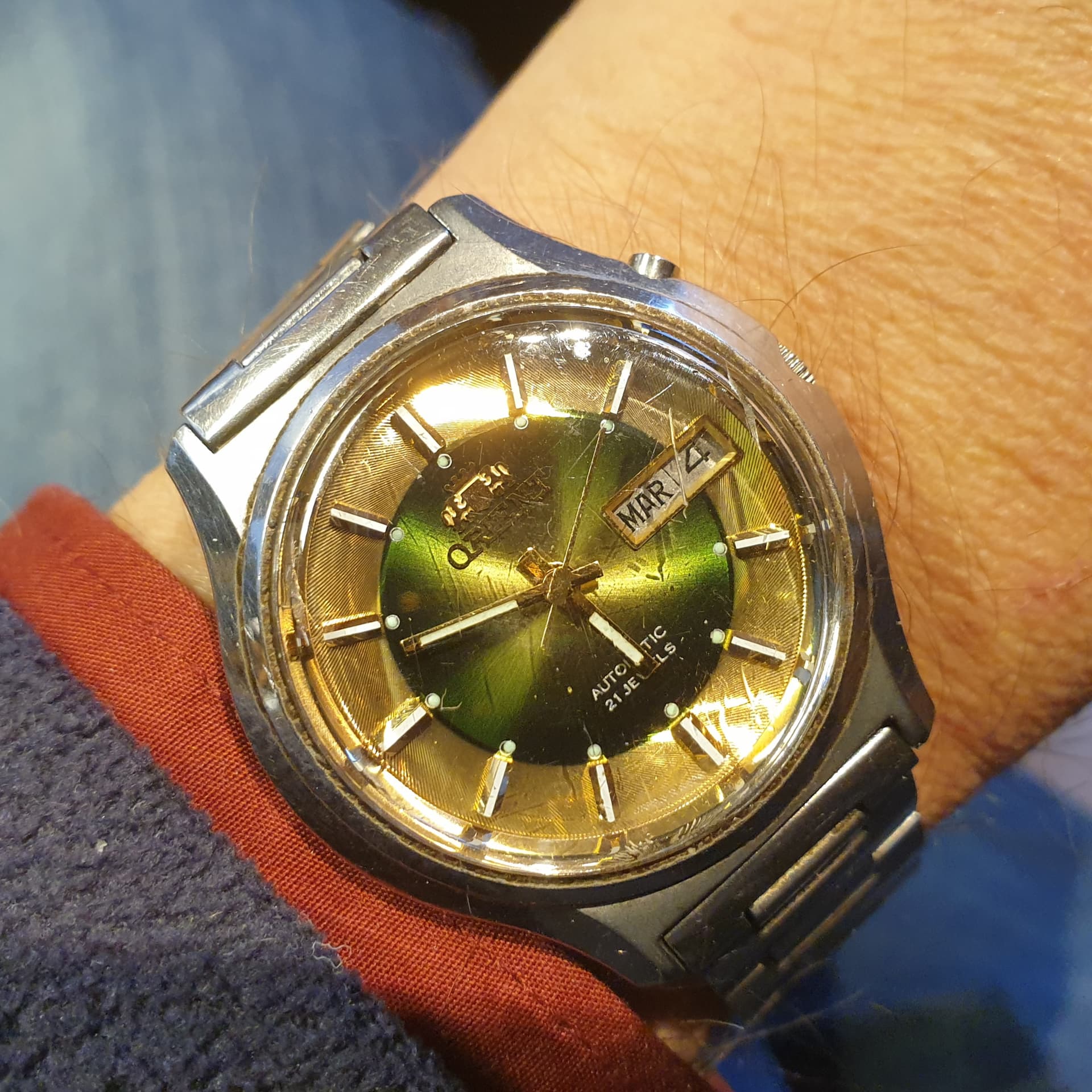 Mooie kastvorm! Wijzerplaat is fantastisch, met een fijne spiraaltextuur in de ring die prachtig met licht speelt, en een magnifiek groen middendeel.