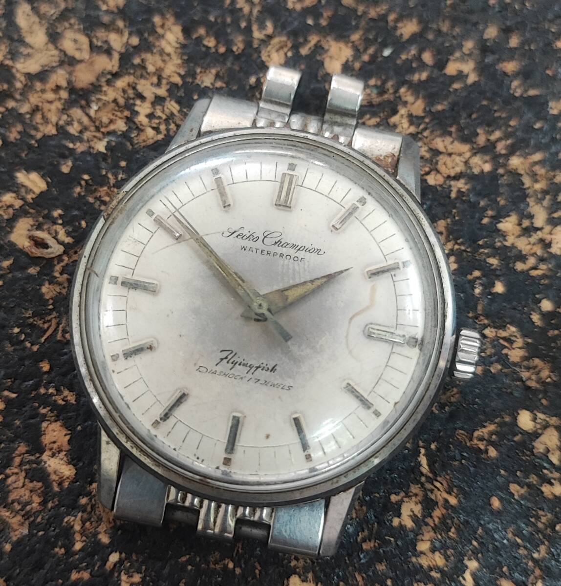 Een Seiko Champion FlyingFish. Ik heb er al eentje, maar daarvan is de wijzerplaat slecht. Deze is ook niet zo heel mooi, maar hiervan lijkt de wijzerplaat in ieder geval beter. Eens kijken, wat we ervan kunnen maken.