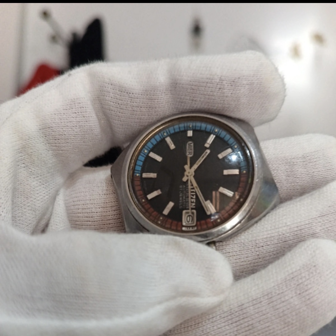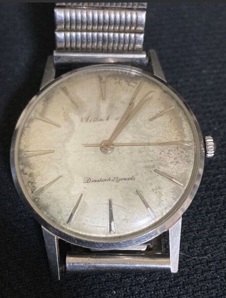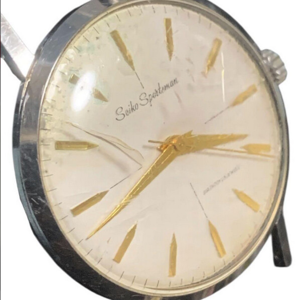 Wel uiteraard met wat issues. Uurwerk loopt niet lekker, scharnier van het achterdeksel gebroken, foute minutenwijzer, foute kroon, lelijke reparatie aan de bezel…