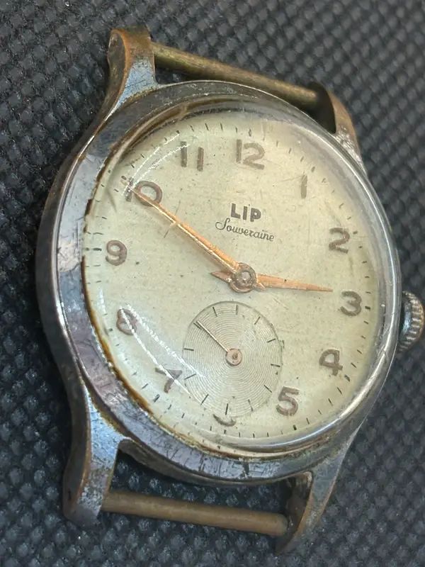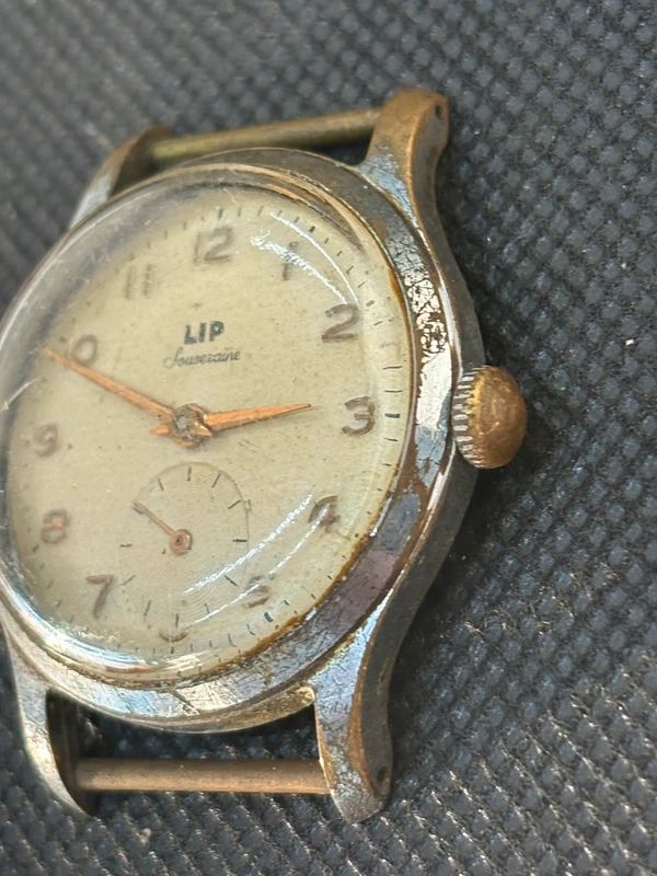 Er zit een mooie wijzerplaat in met een verticaal streepjespatroon, en er zitten wat krassen in het glas, maar het kan goed opgeknapt worden.