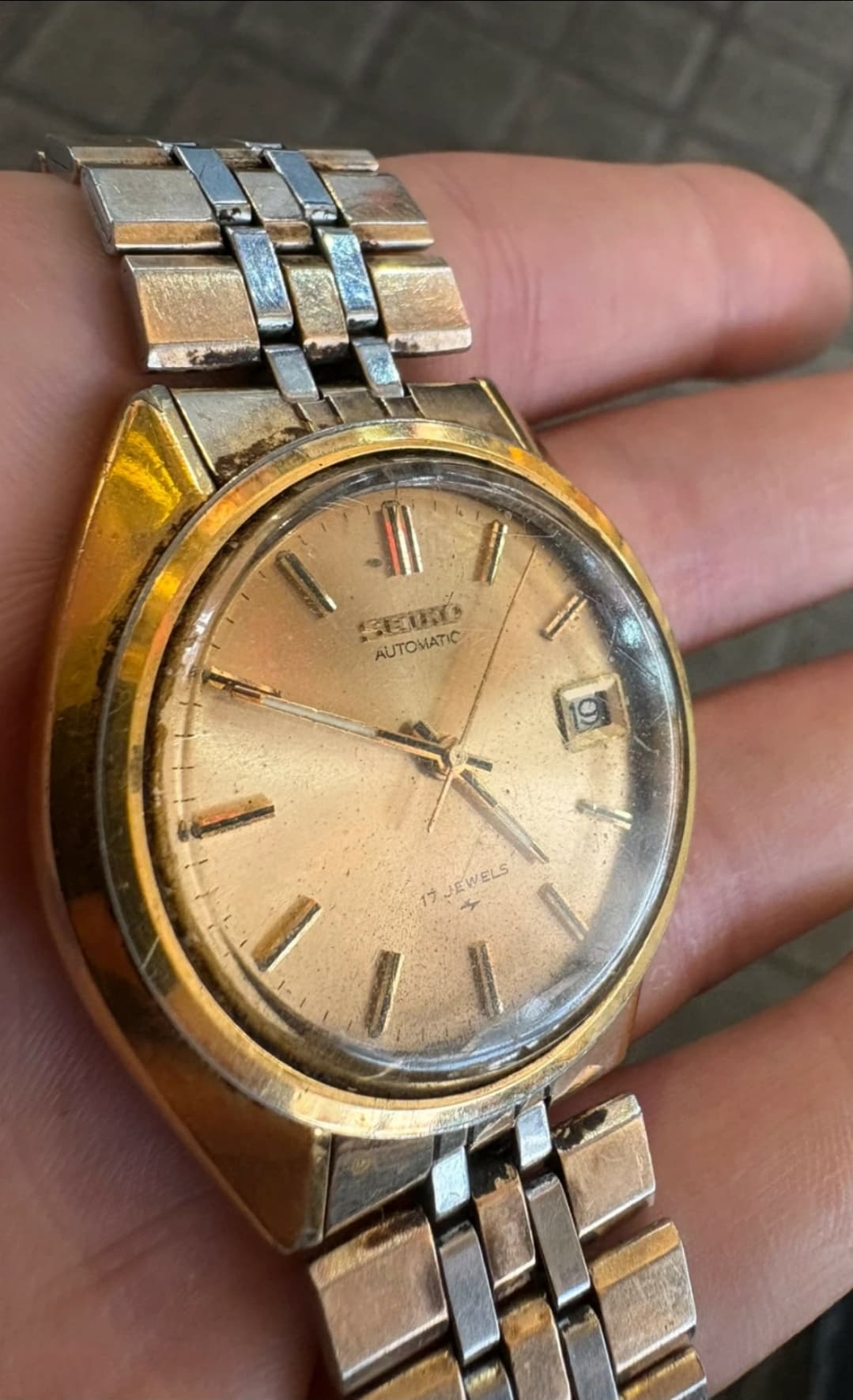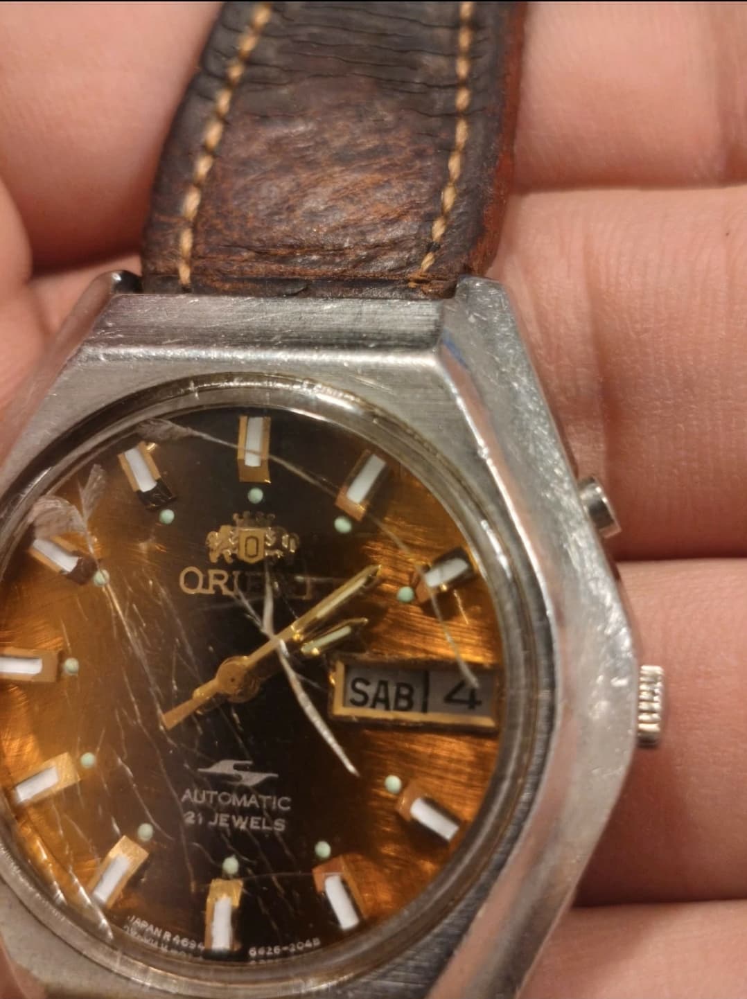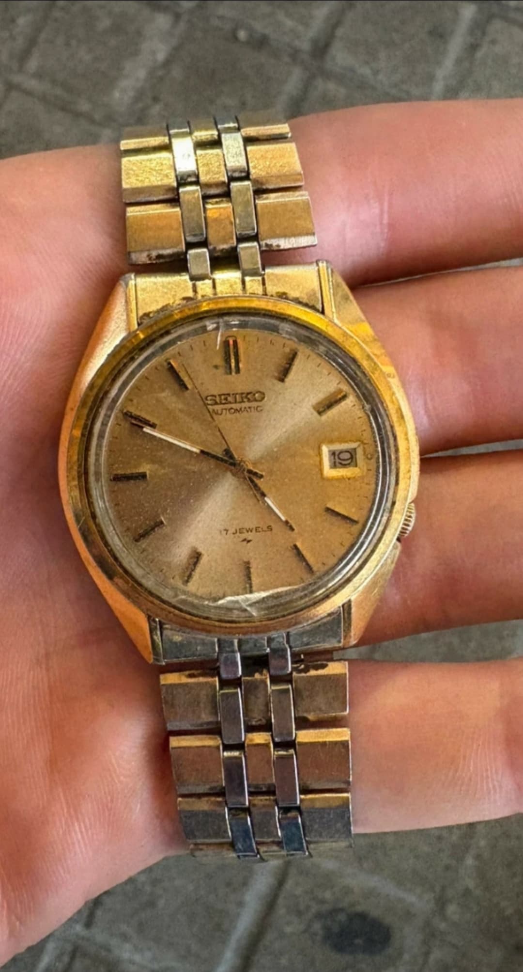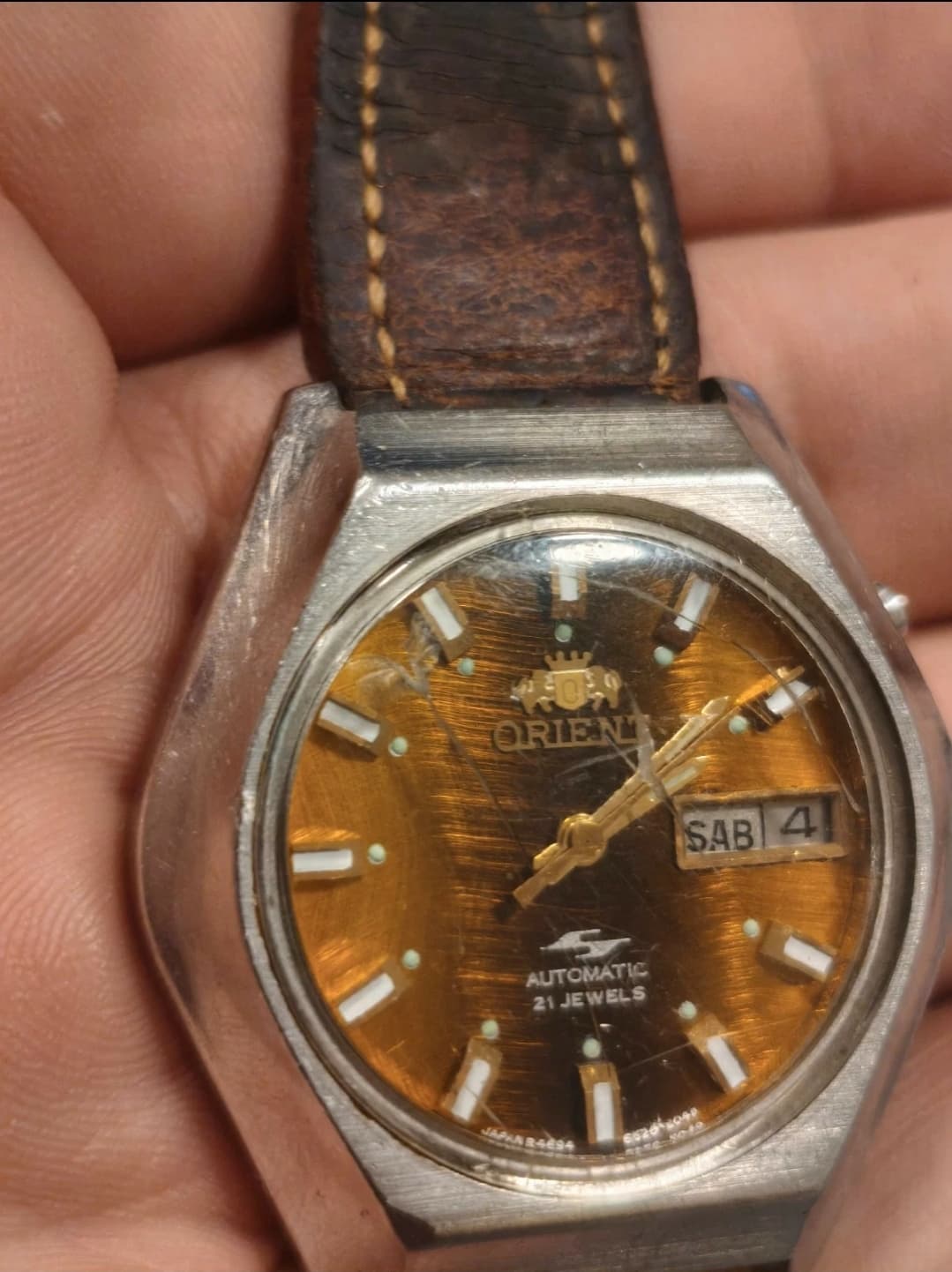 Op de valreep toch een koopstopstop😁, en Orientje met een speciale bronzen plaat en een Seiko die ik nog niet kan plaatsen. Daini, lijkt een 7005, maar andere wijzers en kroon dichtbij de4, zoals meestal bij de 7009. Besef nu dat het misschien een 7002 is, met mooie slanke wijzers.