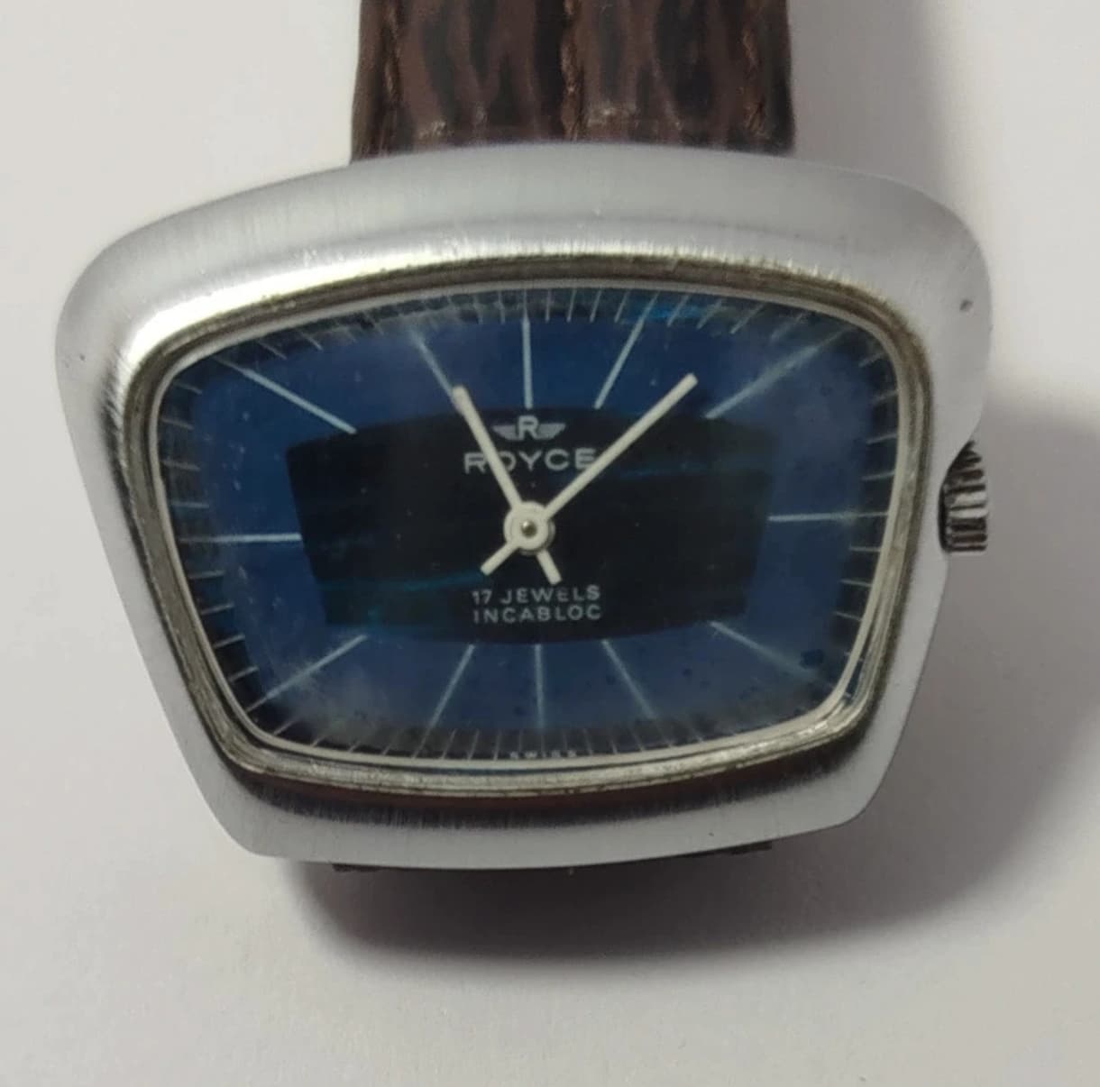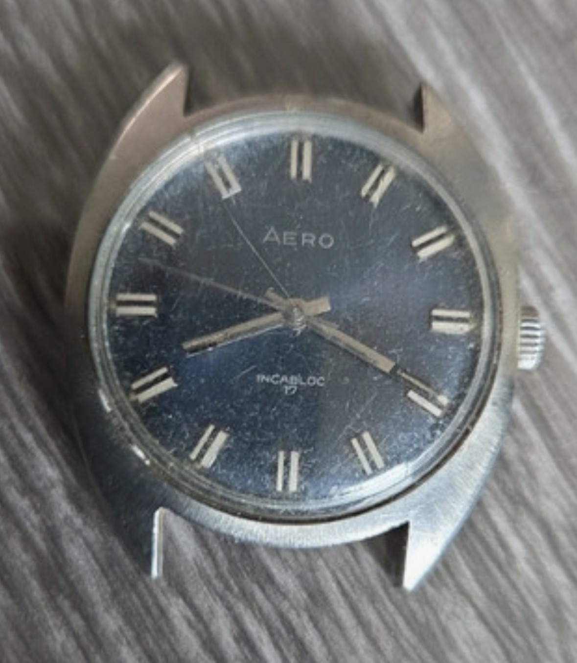 De onderste pusher lijkt vast te zitten. Of het is optisch bedrog. De kroon is ooit vervangen, maar als je het belangrijk vindt ga je een passende wel vinden. De kast is waarschijnlijk gemaakt van dun materiaal, zo te zien. Goed oppassen als je eraan werkt, al is het maar met bandjes wisselen.