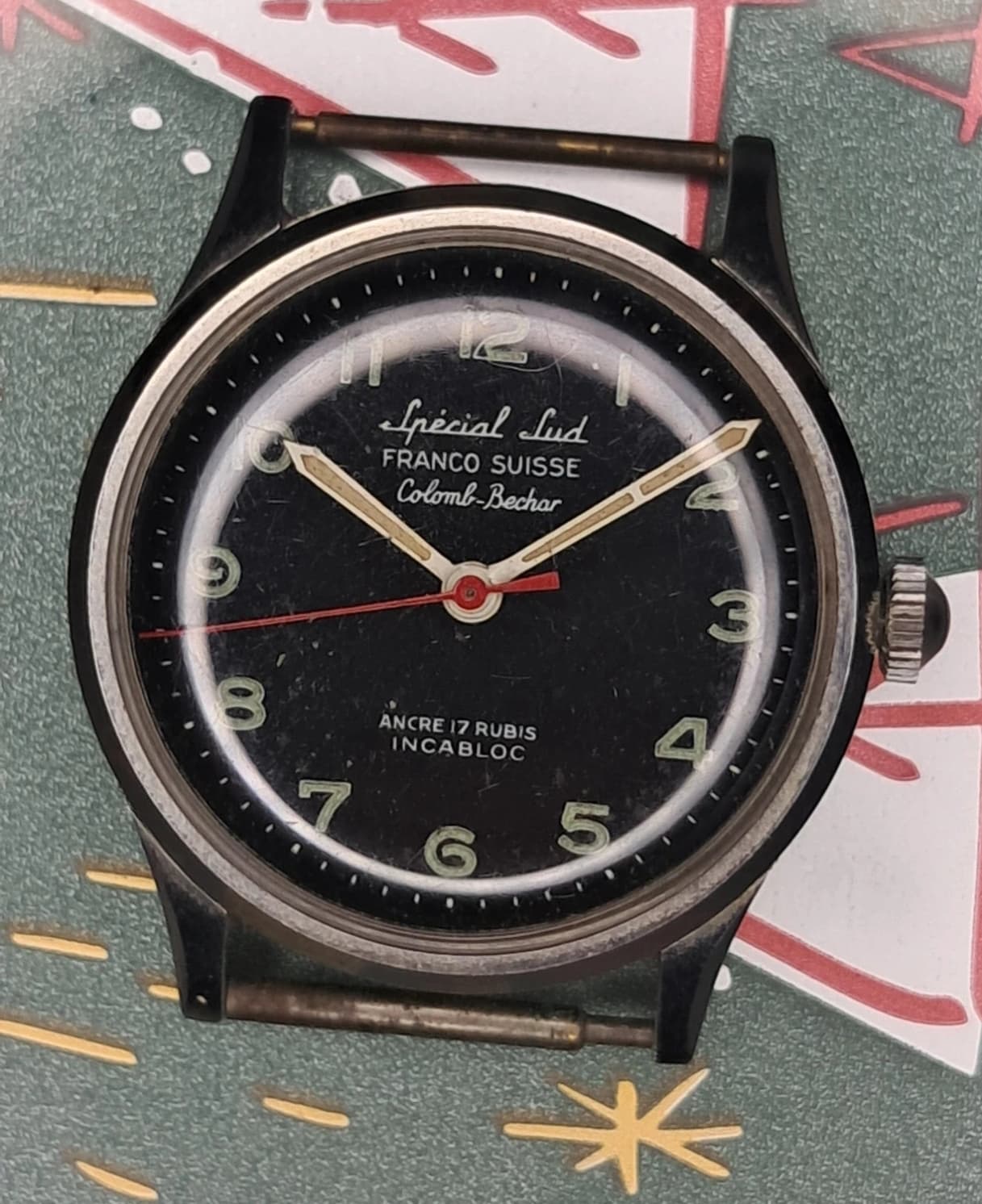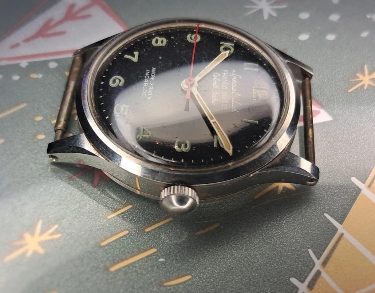 Spécial Sud is gek, toch? Dat zet je niet zomaar op de wijzerplaat, lijkt mij. Franco Suisse is hoe men de mix-en-match horloges noemden met een Frans uurwerk en o.a. Zwitserse Incabloc, lees ik her en der. Alle tekstregels op de wijzerplaat duiden niet op een merk, meer als uitleg - en dus leuke hints voor iemand in 2026 die er de ballen verstand van heeft. Maar een stuk huisvlijt zal het niet zijn, daar is het te specifiek voor.