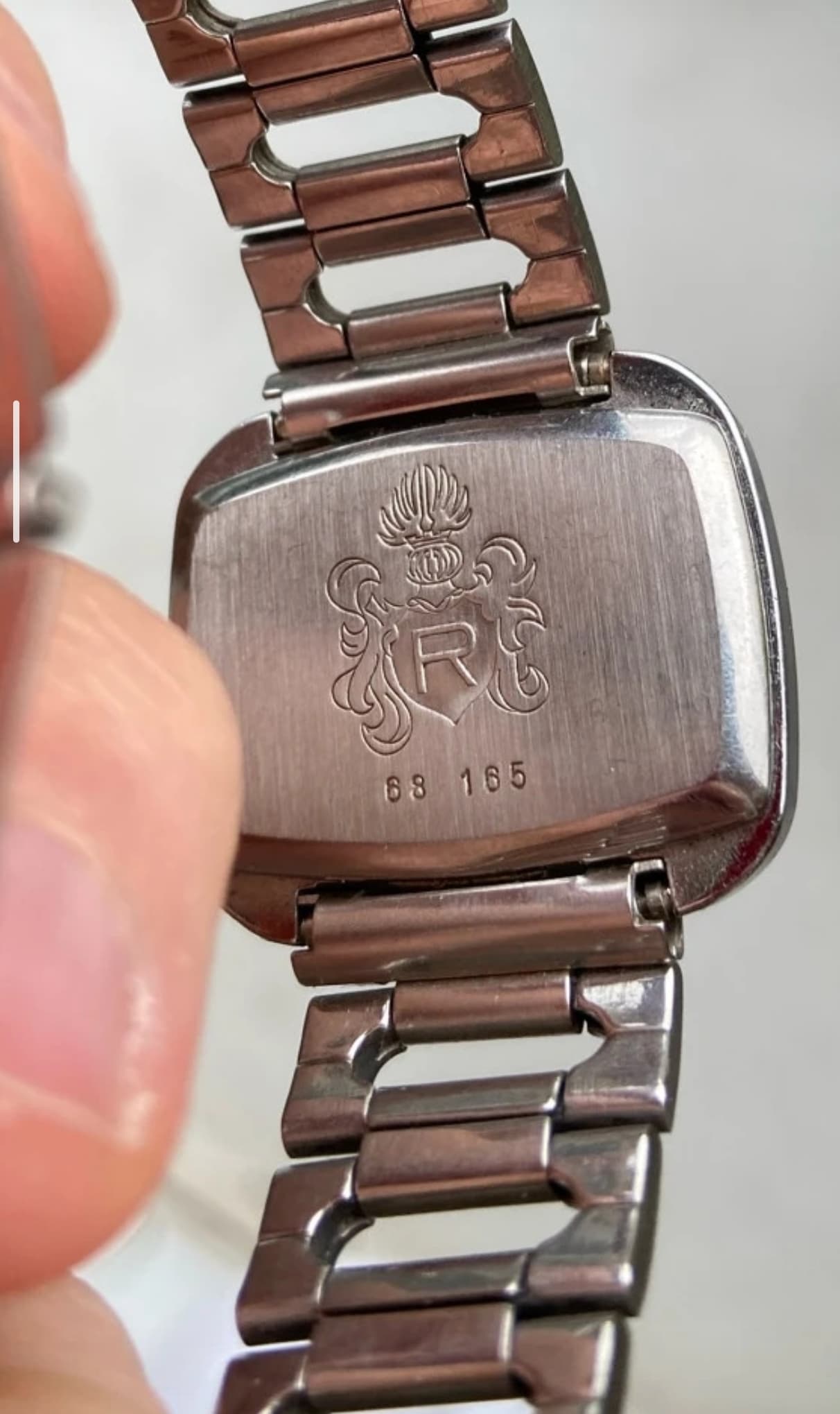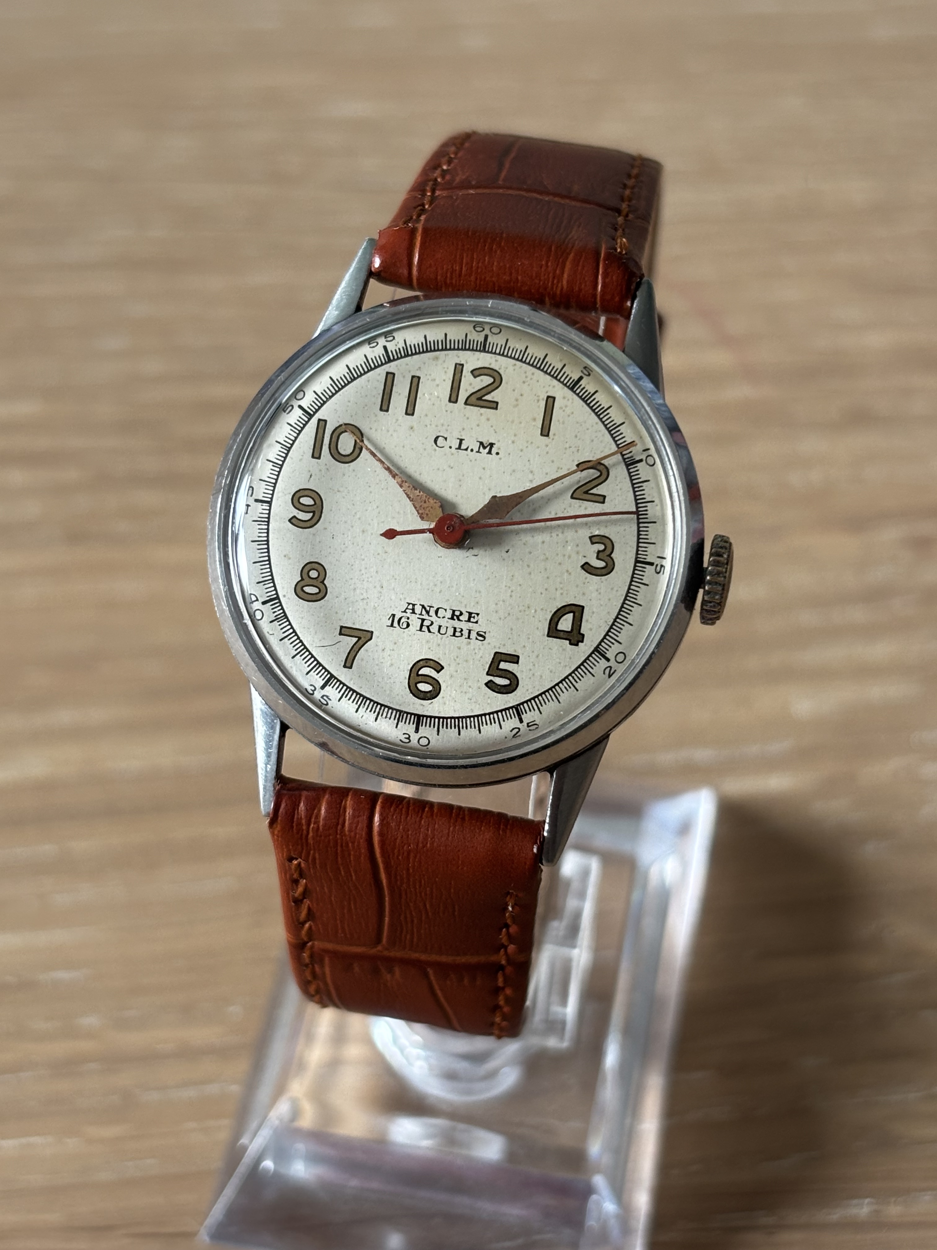 Het bandje dat erbij zat is mwa, maar heb ik er nog even op gezet. De lunette is van messing, met het afgeschuinde gedeelte nog een soort chroomlaagje zichtbaar. Deze wonderlijke kleurcombinatie lijkt mij wel origineel, want ik zie hem vaker online, als ik op deze referentie zoek.