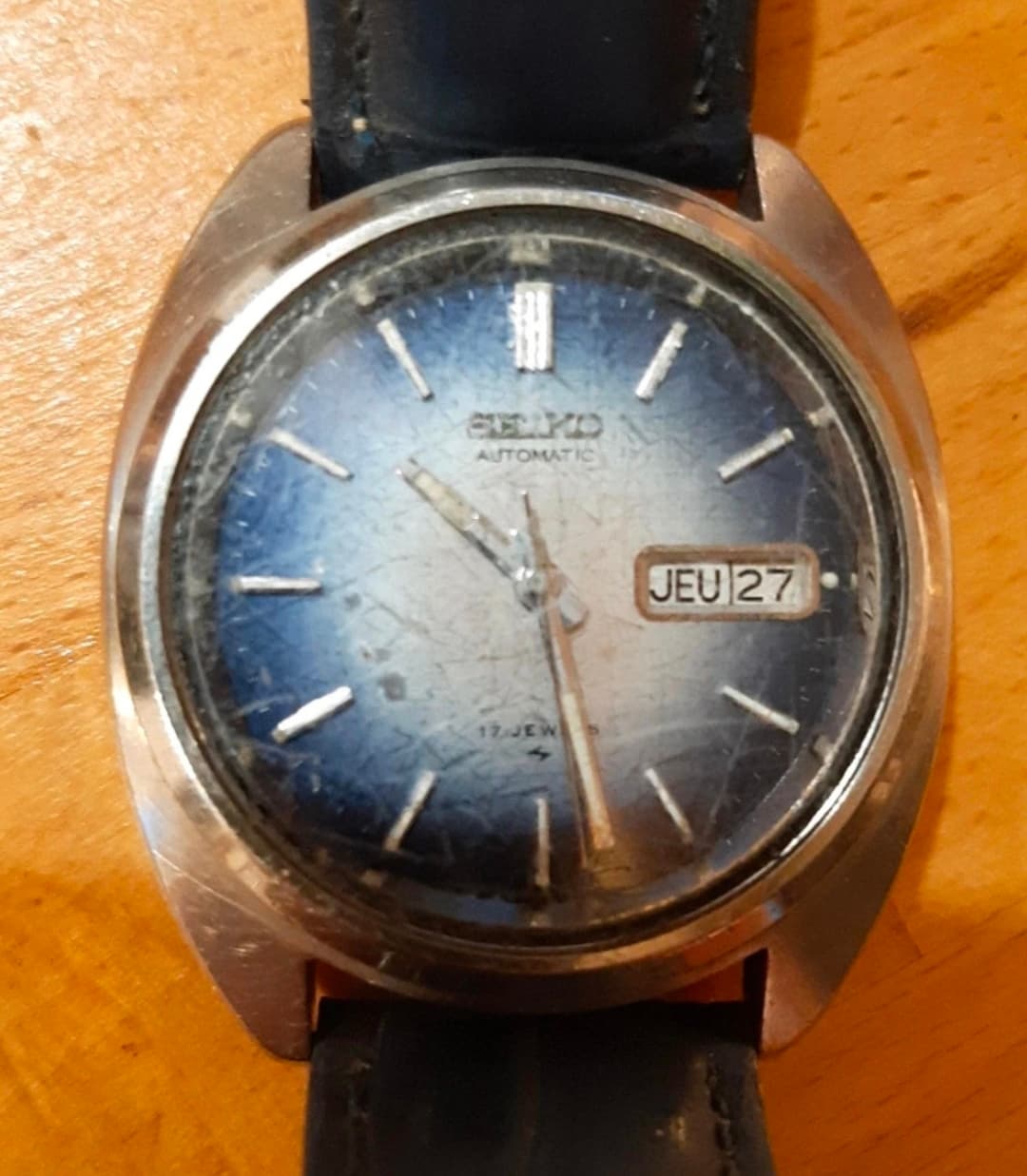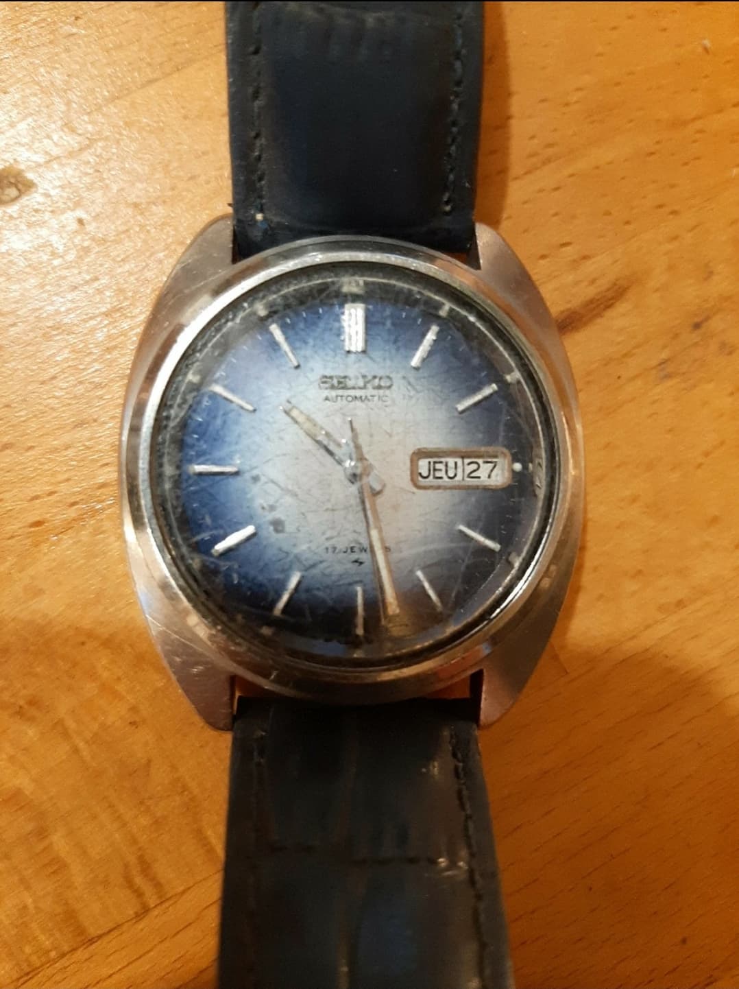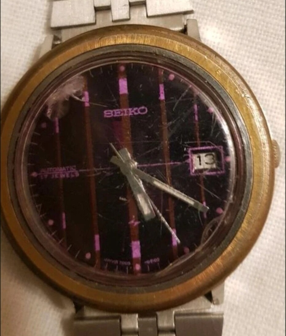 Deze 7005-8190 heeft een nieuw oud plexi gekregen dat ik heb gepolijst. Precies hetzelfde toevallig. Nu is zichtbaar dat de wijzerplaat wat aangetast is, niet duidelijk waardoor precies. Wijzers zijn mooi en uurwerk is nog uitstekend, ziet er haast als nieuw uit.