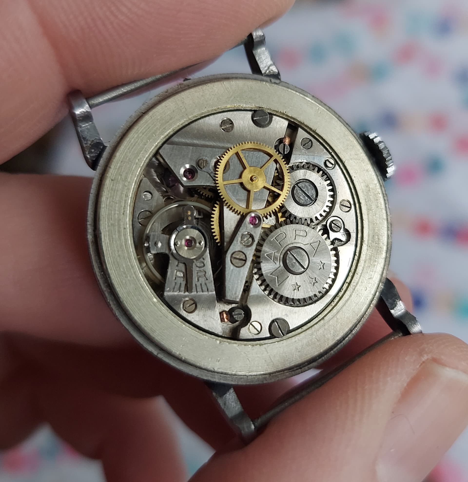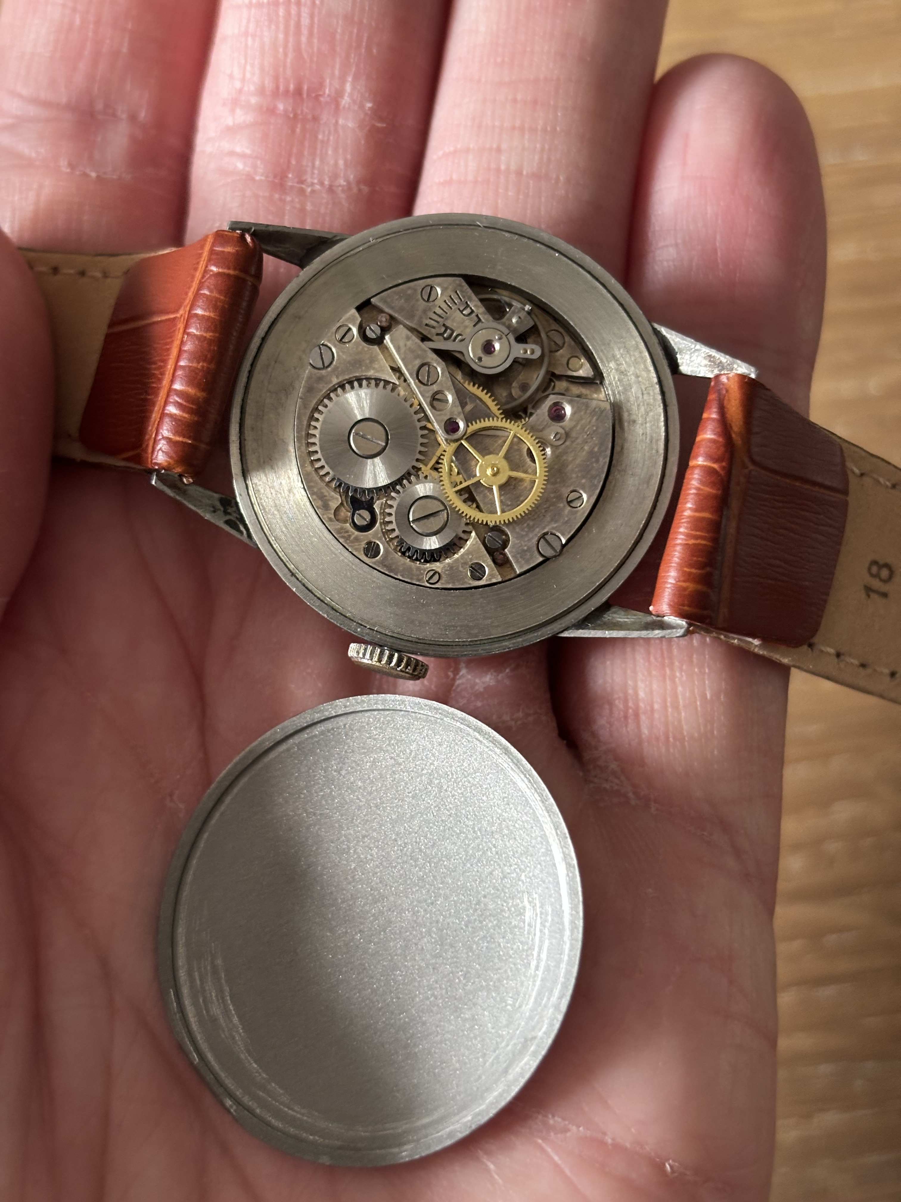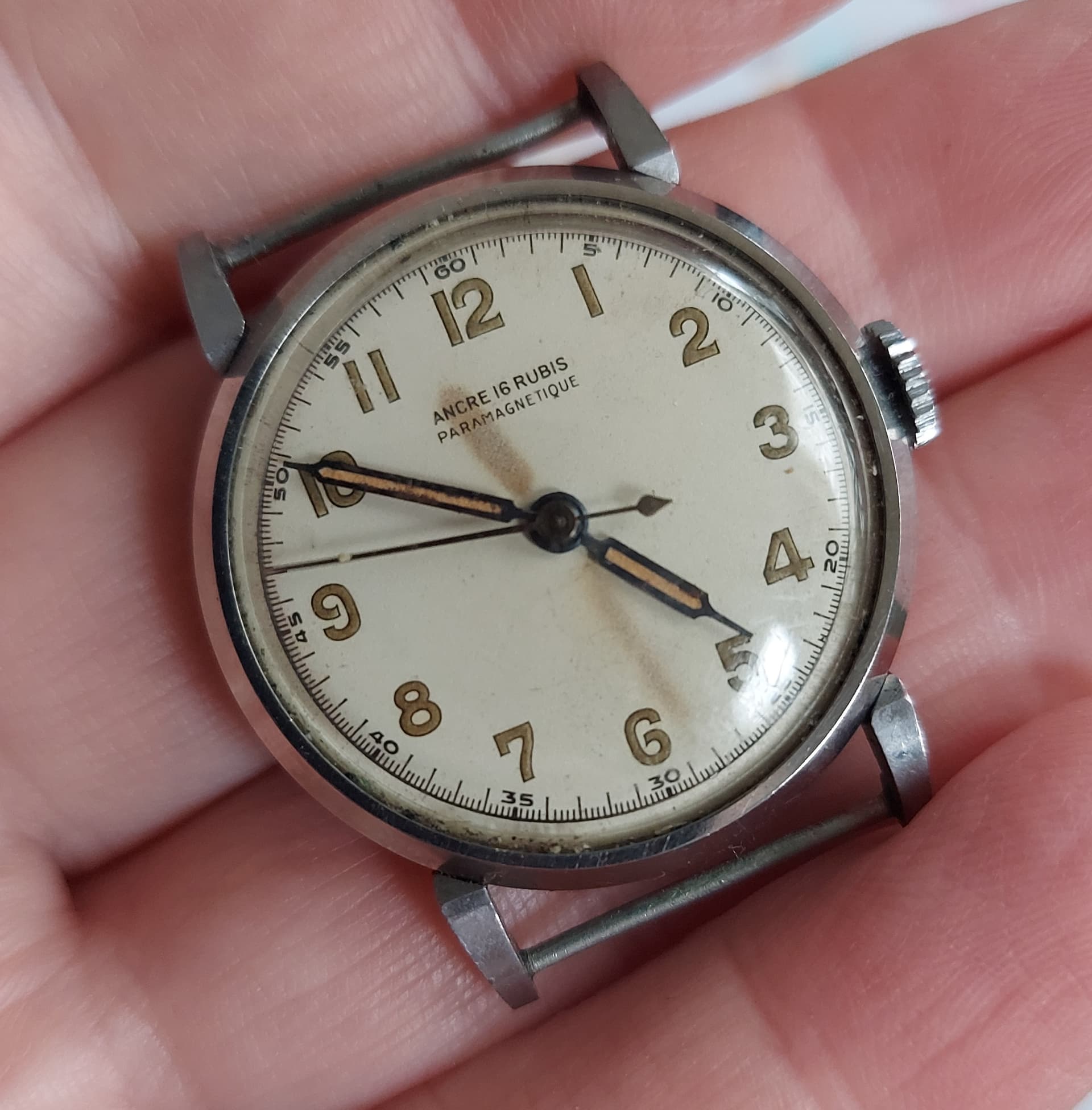 Hij is al binnen, 32mm ongeveer. Loopt. Kaliber uurwerk geen idee. Mooi stalen kastje. “Paramagnetique”. Die kende ik nog niet ![]()