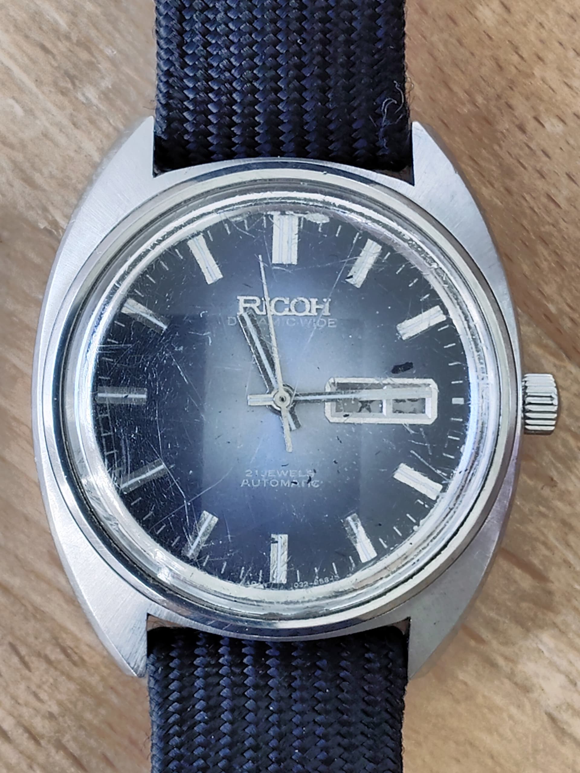 Deze twee Ricoh, een Dynamic Wide met blauwe wijzerplaat en een Ricoh Shark met de kroon op 4 draai je de inner bezel rond.