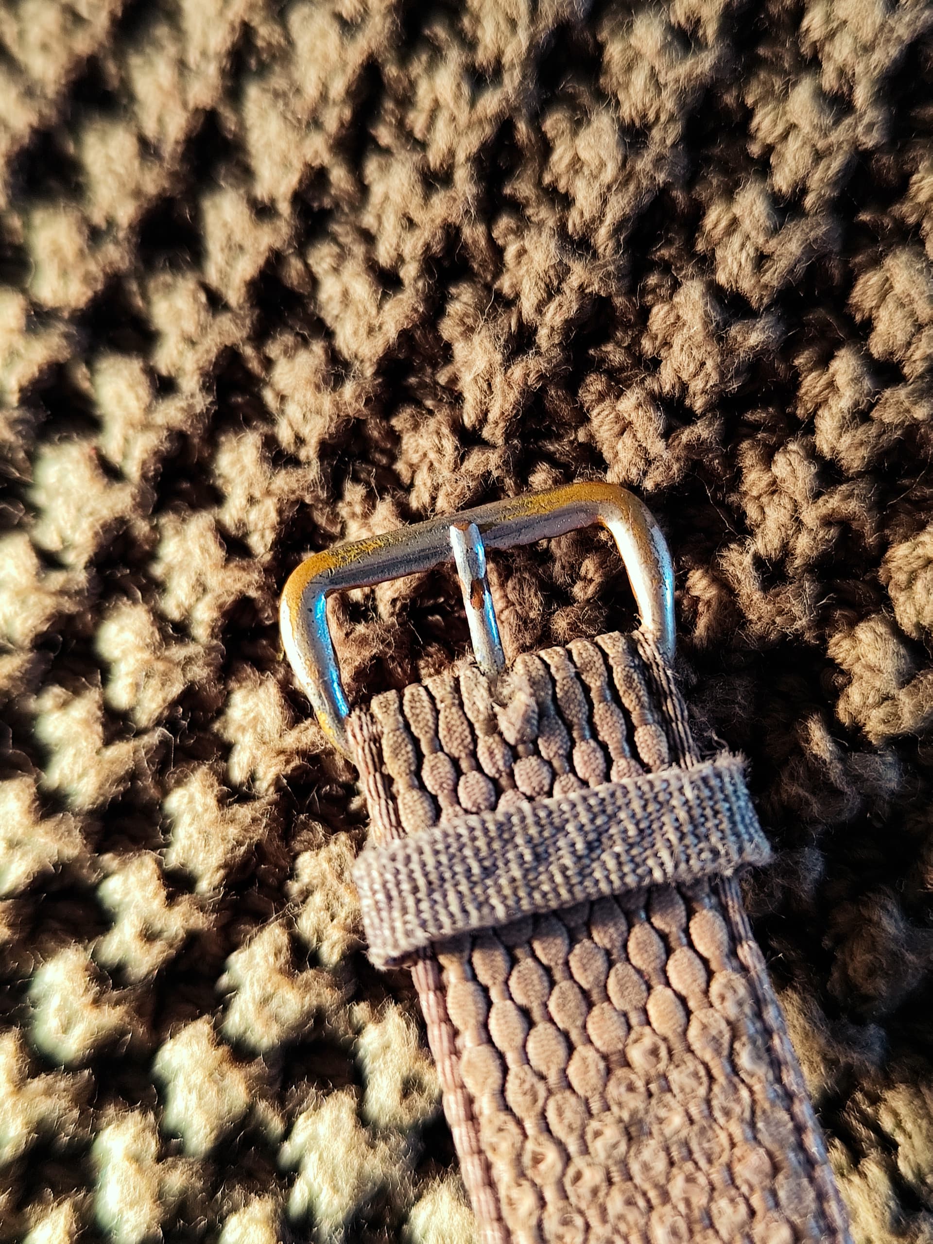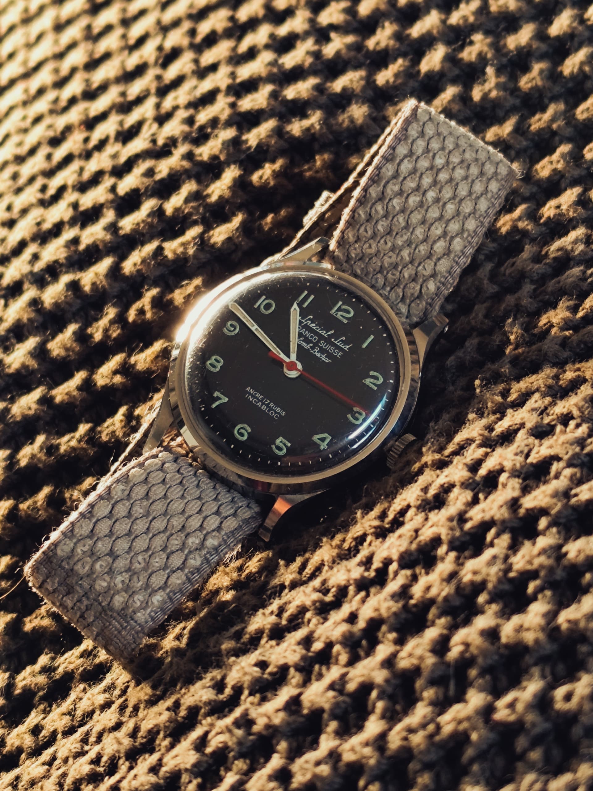 Sinds aanschaf was ik op zoek naar een passend canvas bandje. Ik vroeg me af of ik niet té kritisch was, want niets kon mij bekoren voor dit specifieke horloge. Soms is het leven niet zo moeilijk: dit bandje had ik al van een ander Frans horloge in militaire stijl, ik dacht alleen dat het te klein zou zijn. Toch maar eens passen - Et voilá!